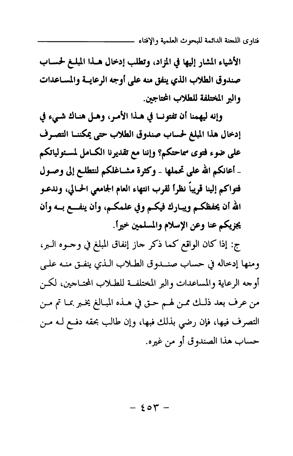 الأشياء المشار إليها في المزاد، وتطلب إدخال هذا المبلغ لحساب صندوق الطلاب الذي ينفق منه على أوجه الرعاية والمساعدات والبر المختلفة للطلاب المحتاجين. وإنه ليهمنا أن تفتونا في هذا الأمر، وهل هناك شيء في إدخال هذا المبلغ لحساب صندوق الطلاب حتى يمكننا التصرف على ضوء فتوى سماحتكم؟ وإننا مع تقديرنا الكامل لمسئولياتكم -أعانكم الله على تحملها- وكثرة مشاغلكم؛ لنتطلع إلى وصول فتواكم إلينا قريبا؛ نظرا لقرب انتهاء العام الجامعي الحالي، وندعو الله أن يحفظكم ويبارك فيكم وفي علمكم، وأن ينفع به وأن يجزيكم عنا وعن الإسلام والمسلمين خيرا.