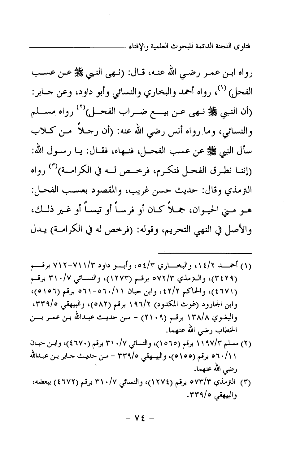 رواه ابن عمر رضي الله عنه، قال: «نهى النبي -صلى الله عليه وسلم- عن عسب الفحل (¬1) » رواه أحمد والبخاري والنسائي وأبو داود وعن جابر «أن النبي -صلى الله عليه وسلم- نهى عن بيع ضراب الفحل (¬2) » رواه مسلم والنسائي وما رواه أنس رضي الله عنه: «أن رجلا من كلاب سأل النبي -صلى الله عليه وسلم- عن عسب الفحل، فنهاه، فقال: يا رسول الله، إننا نطرق الفحل فنكرم، فرخص له في الكرامة (¬3) » رواه الترمذي وقال: حديث حسن غريب والمقصود بعسب الفحل: هو مني الحيوان، جملا كان أو فرسا أو تيسا أو غير ذلك، والأصل في النهي التحريم، وقوله: (فرخص له في الكرامة) يدل