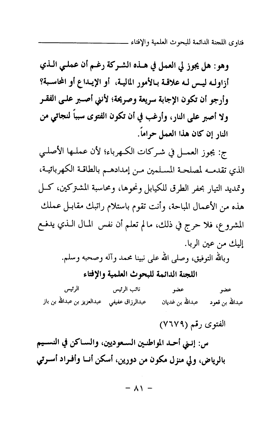 ج: يجوز العمل في شركات الكهرباء؛ لأن عملها الأصلي الذي تقدمه لمصلحة المسلمين من إمدادهم بالطاقة الكهربائية، وتمديد التيار بحفر الطرق للكيابل ونحوها، ومحاسبة المشتركين، كل هذه من الأعمال المباحة، وأنت تقوم باستلام راتبك مقابل عملك المشروع، فلا حرج في ذلك، ما لم تعلم أن نفس المال الذي يدفع إليك من عين الربا. وبالله التوفيق، وصلى الله على نبينا محمد وآله وصحبه وسلم.