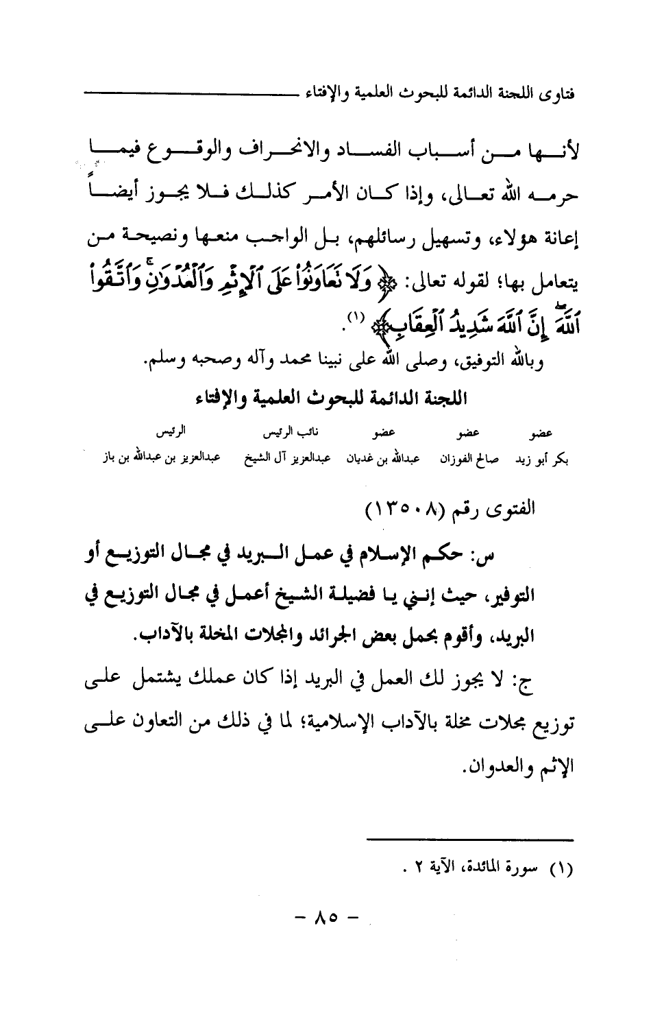 لأنها من أسباب الفساد والانحراف والوقوع فيما حرمه الله تعالى، وإذا كان الأمر كذلك فلا يجور أيضا إعانة هؤلاء، وتسهيل رسائلهم، بل الواجب منعها ونصيحة من يتعامل بها؛ لقوله تعالى: {وَلَا تَعَاوَنُوا عَلَى الْإِثْمِ وَالْعُدْوَانِ وَاتَّقُوا اللَّهَ إِنَّ اللَّهَ شَدِيدُ الْعِقَابِ} (¬1) وبالله التوفيق، وصلى الله على نبينا محمد وآله وصحبه وسلم.