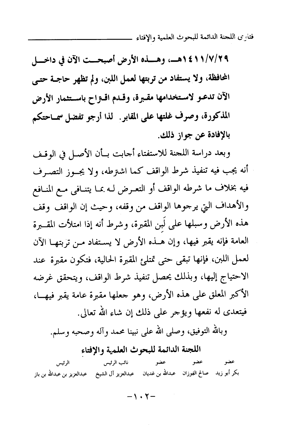 29 \ 7 \ 1411هـ، وهذه الأرض أصبحت الآن في داخل المحافظة، ولا يستفاد من تربتها لعمل اللبن، ولم تظهر حاجة حتى الآن تدعو لاستخدامها مقبرة، وقدم اقتراح باستثمار الأرض المذكورة، وصرف غلتها على المقابر. لذا أرجو تفضل سماحتكم بالإفادة عن جواز ذلك.
