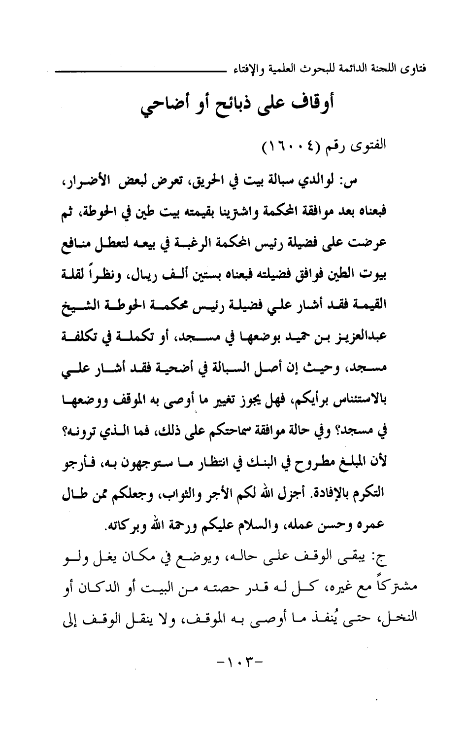 س: لوالدي سبالة بيت في الحريق تعرض لبعض الأضرار، فبعناه بعد موافقة المحكمة واشترينا بقيمته بيت طين في الحوطة ثم عرضت على فضيلة رئيس المحكمة الرغبة في بيعه لتعطل منافع بيوت الطين فوافق فضيلته فبعناه بستين ألف ريال، ونظرا لقلة القيمة فقد أشار علي فضيلة رئيس محكمة الحوطة الشيخ عبد العزيز بن حميد بوضعها في مسجد، أو تكملة في تكلفة مسجد، وحيث إن أصل السبالة في أضحية فقد أشار علي بالاستئناس برأيكم، فهل يجوز تغيير ما أوصى به الموقف ووضعها في مسجد؟ وفي حالة موافقة سماحتكم على ذلك، فما الذي ترونه؟ لأن المبلغ مطروح في البنك في انتظار ما ستوجهون به، فأرجو التكرم بالإفادة. أجزل الله لكم الأجر والثواب، وجعلكم ممن طال عمره وحسن عمله، والسلام عليكم ورحمة الله وبركاته.
