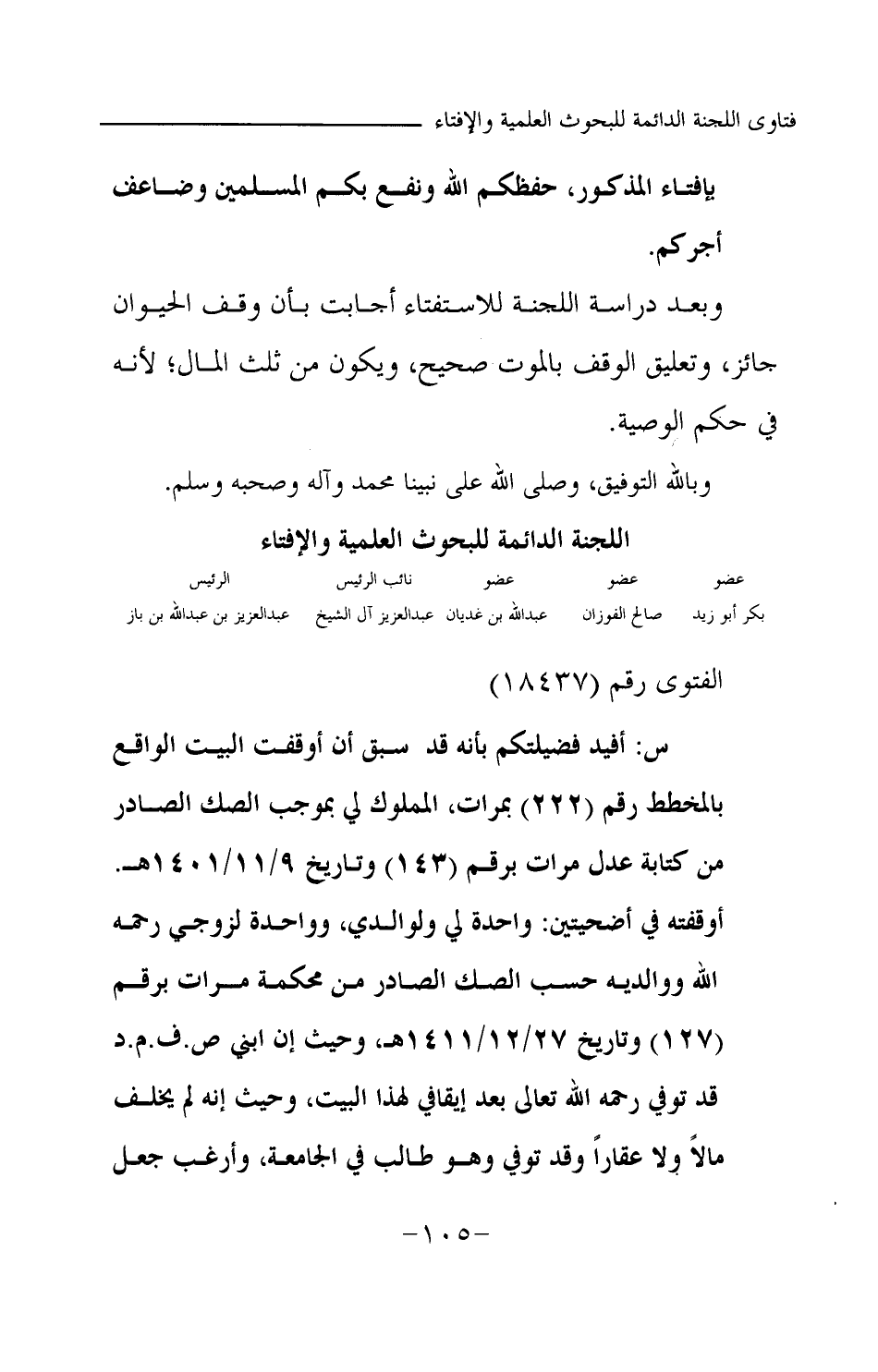 س: أفيد فضيلتكم بأنه قد سبق أن أوقفت البيت الواقع بالمخطط رقم (222) بمرات المملوك لي بموجب الصك الصادر من كتابة عدل مرات برقم (143) وتاريخ 9 \ 11 \ 1401هـ.