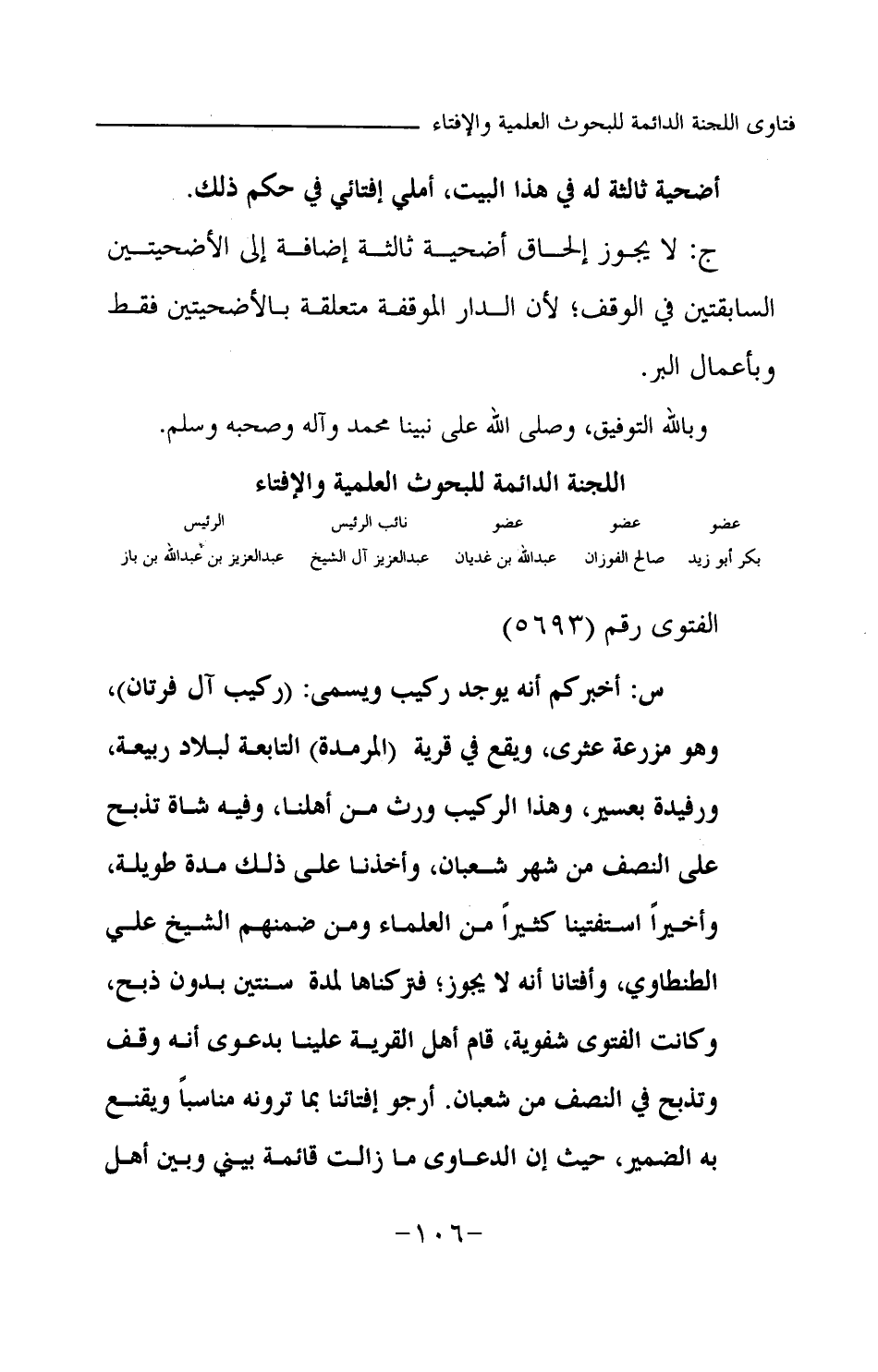 س: أخبركم أنه يوجد ركيب ويسمى: (ركيب آل فرتان) ، وهو مزرعة عثرى، ويقع في قرية (المرمدة) التابعة لبلاد ربيعة ورفيدة بعسير وهذا الركيب ورث من أهلنا، وفيه شاة تذبح على النصف من شهر شعبان، وأخذنا على ذلك مدة طويلة، وأخيرا استفتينا كثيرا من العلماء ومن ضمنهم الشيخ علي الطنطاوي وأفتانا أنه لا يجوز، فتركناها لمدة سنتين بدون ذبح، وكانت الفتوى شفوية، قام أهل القرية علينا بدعوى أنه وقف وتذبح في النصف من شعبان. أرجو إفتائنا بما ترونه مناسبا ويقنع به الضمير، حيث إن الدعاوى ما زالت قائمة بيني وبين أهل