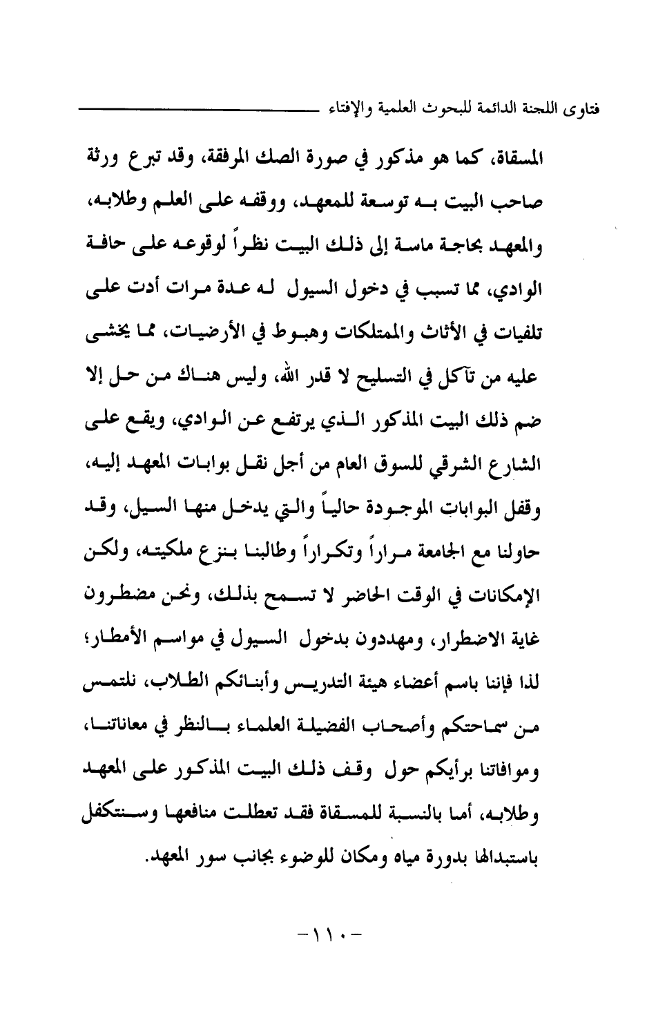 المسقاة، كما هو مذكور في صورة الصك المرفقة، وقد تبرع ورثة صاحب البيت به توسعة للمعهد، ووقفه على العلم وطلابه، والمعهد بحاجة ماسة إلى ذلك البيت نظرا لوقوعه على حافة الوادي، مما تسبب في دخول السيول له عدة مرات أدت على تلفيات في الأثاث والممتلكات وهبوط في الأرضيات، مما يخشى عليه من تآكل في التسليح لا قدر الله، وليس هناك من حل إلا ضم ذلك البيت المذكور الذي يرتفع عن الوادي، ويقع على الشارع الشرقي للسوق العام من أجل نقل بوابات المعهد إليه، وقفل البوابات الموجودة حاليا والتي يدخل منها السيل، وقد حاولنا مع الجامعة مرارا وتكرارا وطالبنا بنزع ملكيته، ولكن الإمكانات في الوقت الحاضر لا تسمح بذلك، ونحن مضطرون غاية الاضطرار، ومهددون بدخول السيول في مواسم الأمطار؛ لذا فإننا باسم أعضاء هيئة التدريس وأبنائكم الطلاب، نلتمس من سماحتكم وأصحاب الفضيلة العلماء بالنظر في معاناتنا، وموافاتنا برأيكم حول وقف ذلك البيت المذكور على المعهد وطلابه، أما بالنسبة للمسقاة فقد تعطلت منافعها وسنتكفل باستبدالها بدورة مياه ومكان للوضوء بجانب سور المعهد.
