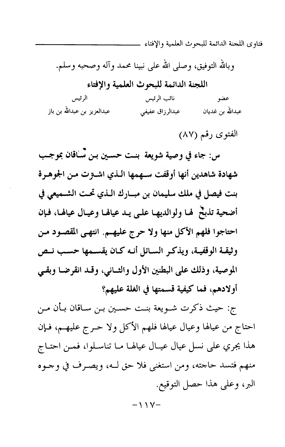 ج: حيث ذكرت شويعة بنت حسين بن ساقان بأن من احتاج من عيالها وعيال عيالها فلهم الأكل ولا حرج عليهم، فإن هذا يجري على نسل عيال عيال عيالها ما تناسلوا، فمن احتاج منهم فتسد حاجته، ومن استغنى فلا حق له، ويصرف في وجوه البر، وعلى هذا حصل التوقيع.