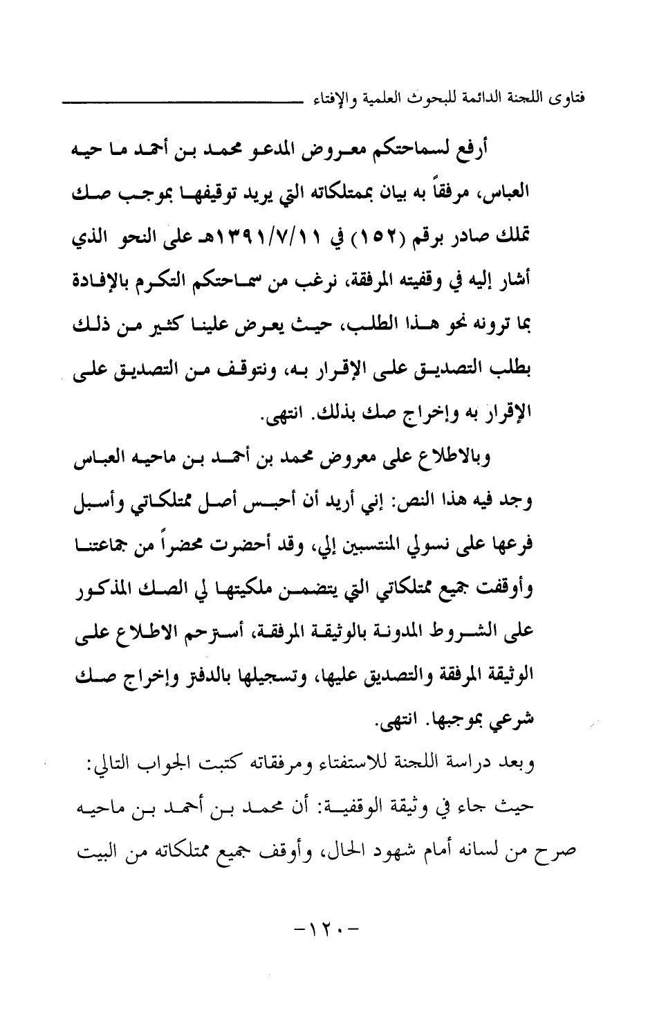 أرفع لسماحتكم معروض المدعو محمد بن أحمد ماحيه العباس، مرفقا به بيان بممتلكاته التي يريد توقيفها بموجب صك تملك صادر برقم (152) في 311 \ 7 \ 1391هـ على النحو الذي أشار إليه في وقفيته المرفقة، نرغب من سماحتكم التكرم بالإفادة بما ترونه نحو هذا الطلب، حيث يعرض علينا كثير من ذلك بطلب التصديق على الإقرار به، ونتوقف من التصديق على الإقرار به وإخراج صك بذلك. انتهى.