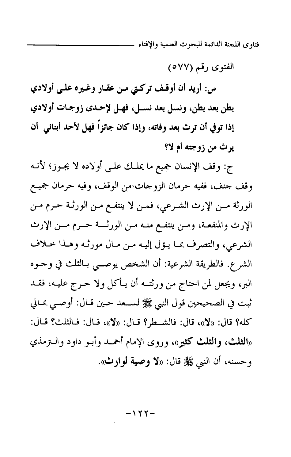 س: أريد أن أوقف تركتي من عقار وغيره على أولادي بطن بعد بطن، ونسل بعد نسل، فهل لإحدى زوجات أولادي إذا توفي أن ترث بعد وفاته، وإذا كان جائزا فهل لأحد أبنائي أن يرث من زوجته أم لا؟