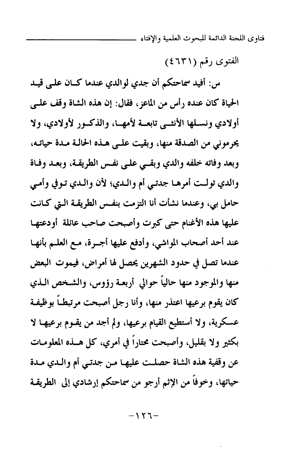 س: أفيد سماحتكم أن جدي لوالدي عندما كان على قيد الحياة كان عنده رأس من الماعز، فقال: إن هذه الشاة وقف على أولادي ونسلها الأنثى تابعة لأمها، والذكور لأولادي، ولا يحرموني من الصدقة منها، وبقيت على هذه الحالة مدة حياته، وبعد وفاته خلفه والدي وبقي على نفس الطريقة، وبعد وفاة والدي تولت أمرها جدتي أم والدي؛ لأن والدي توفي وأمي حامل بي، وعندما نشأت أنا التزمت بنفس الطريقة التي كانت عليها هذه الأغنام حتى كبرت وأصبحت صاحب عائلة أودعتها عند أحد أصحاب المواشي، وأدفع عليها أجرة، مع العلم بأنها عندما تصل في حدود الشهرين يحصل لها أمراض، فيموت البعض منها والموجود منها حاليا حوالي أربعة رءوس، والشخص الذي كان يقوم برعيها اعتذر منها، وأنا رجل أصبحت مرتبطا بوظيفة عسكرية، ولا أستطيع القيام برعيها، ولم أجد من يقوم برعيها لا بكثير ولا بقليل، وأصبحت محتارا في أمري، كل هذه المعلومات عن وقفية هذه الشاة حصلت عليها من جدتي أم والدي مدة حياتها، وخوفا من الإثم أرجو من سماحتكم إرشادي إلى الطريقة