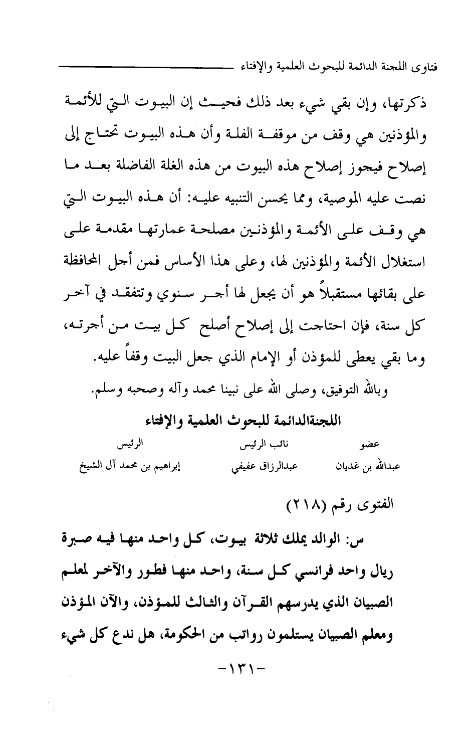 س: الوالد يملك ثلاثة بيوت، كل واحد منها فيه صبرة ريال واحد فرانسي كل سنة، واحد منها فطور والآخر لمعلم الصبيان الذي يدرسهم القرآن والثالث للمؤذن، والآن المؤذن ومعلم الصبيان يستلمون رواتب من الحكومة، هل ندع كل شيء
