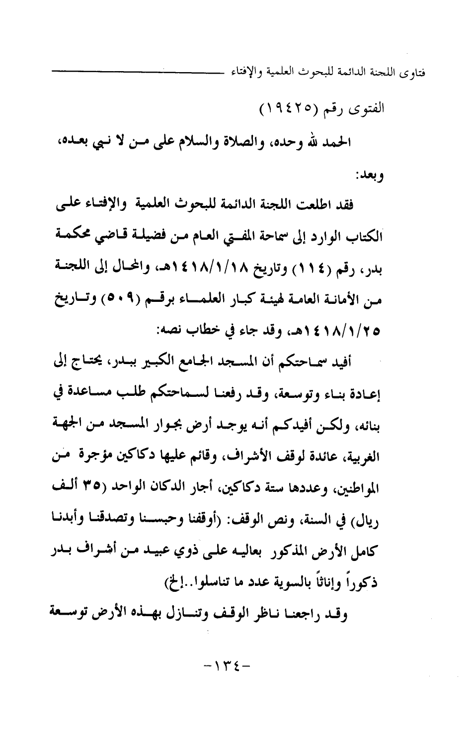 أفيد سماحتكم أن المسجد الجامع الكبير ببدر يحتاج إلى إعادة بناء وتوسعة، وقد رفعنا لسماحتكم طلب مساعدة في بنائه، ولكن أفيدكم أنه يوجد أرض بجوار المسجد من الجهة الغربية، عائدة لوقف الأشراف، وقائم عليها دكاكين مؤجرة من المواطنين، وعددها ستة دكاكين، أجار الدكان الواحد (35 ألف ريال) في السنة، ونص الوقف: (أوقفنا وحبسنا وتصدقنا وأبدنا كامل الأرض المذكور بعاليه على ذوي عبيد من أشراف بدر ذكورا وإناثا بالسوية عدد ما تناسلوا.. إلخ)