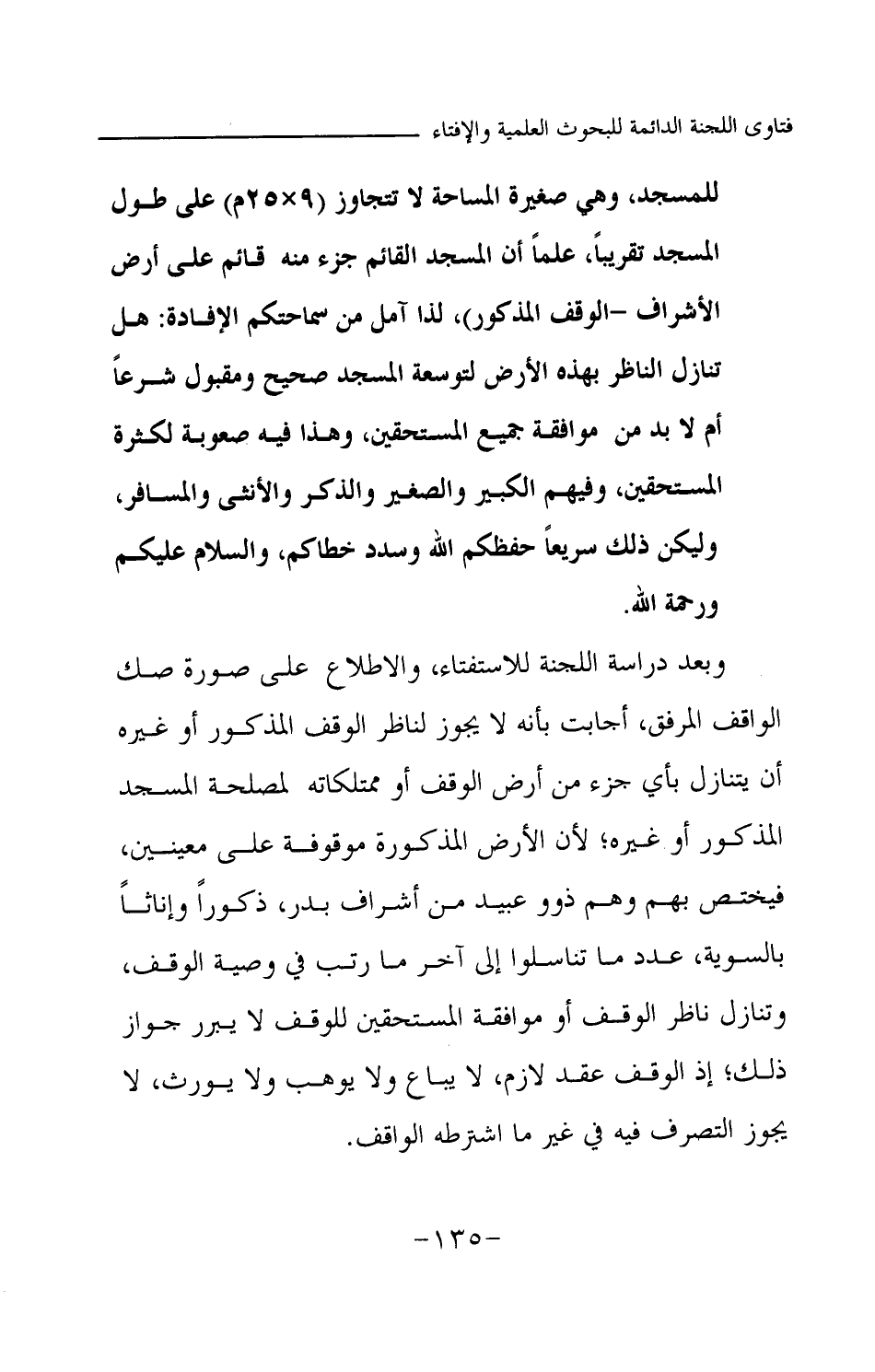 وبعد دراسة اللجنة للاستفتاء، والاطلاع على صورة صك الواقف المرفق، أجابت: بأنه لا يجوز لناظر الوقف المذكور أو غيره أن يتنازل بأي جزء من أرض الوقف أو ممتلكاته لمصلحة المسجد المذكور أو غيره، لأن الأرض المذكورة موقوفة على معينين، فيختص بهم وهم ذوو عبيد من أشراف بدر ذكورا وإناثا بالسوية، عدد ما تناسلوا إلى آخر ما رتب في وصية الوقف، وتنازل ناظر الوقف أو موافقة المستحقين للوقف لا يبرر جواز ذلك؛ إذ الوقف عقد لازم، لا يباع ولا يوهب ولا يورث، لا يجوز التصرف فيه في غير ما اشترطه الواقف.