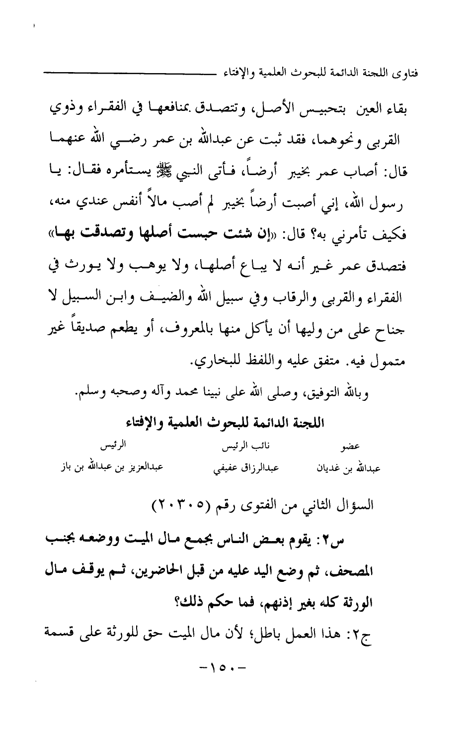 بقاء العين بتحبيس الأصل، وتتصدق بمنافعها في الفقراء وذوي القربى ونحوهما، فقد ثبت عن عبد الله بن عمر رضي الله عنهما قال: «أصاب عمر بخيبر أرضا، فأتى النبي -صلى الله عليه وسلم- يستأمره فقال: يا رسول الله، إني أصبت أرضا بخيبر لم أصب مالا أنفس عندي منه، فكيف تأمرني به؟ قال: إن شئت حبست أصلها وتصدقت بها ". فتصدق عمر غير أنه لا يباع أصلها، ولا يوهب ولا يورث في الفقراء والقربى والرقاب وفي سبيل الله والضيف وابن السبيل لا جناح على من وليها أن يأكل منها بالمعروف، أو يطعم صديقا غير متمول فيه (¬1) » متفق عليه واللفظ للبخاري. وبالله التوفيق، وصلى الله على نبينا محمد وآله وصحبه وسلم.
