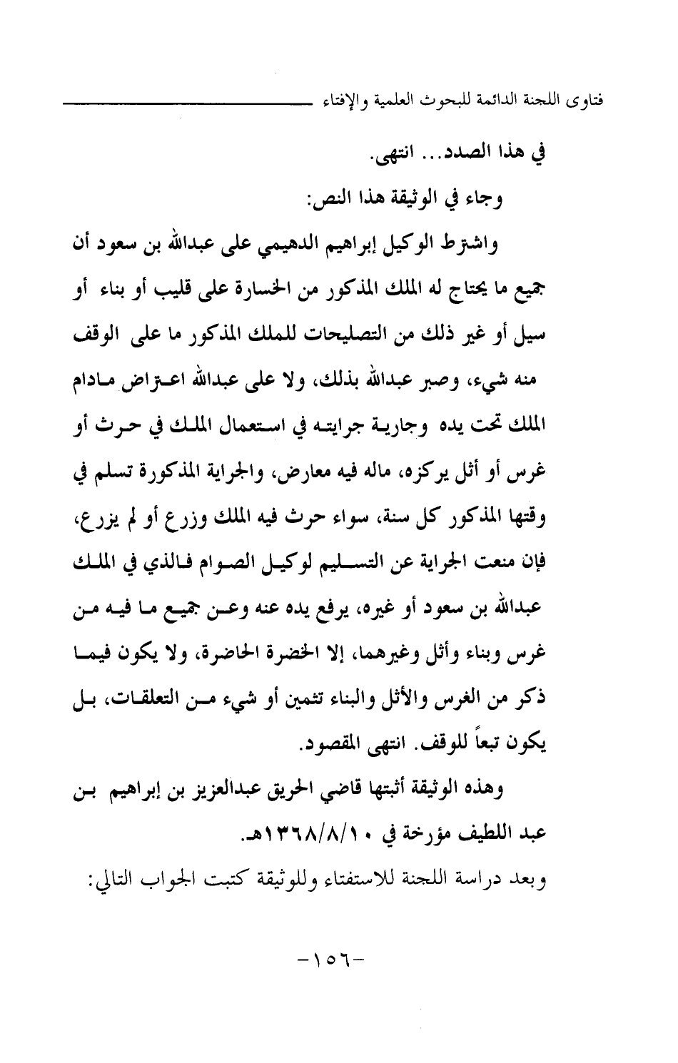 واشترط الوكيل إبراهيم الدهيمي على عبد الله بن سعود أن جميع ما يحتاج له الملك المذكور من الخسارة على قليب أو بناء أو سيل أو غير ذلك من التصليحات للملك المذكور ما على الوقف منه شيء، وصبر عبد الله بذلك، ولا على عبد الله اعتراض ما دام الملك تحت يده وجارية جرايته في استعمال الملك في حرث أو غرس أو أثل يركزه، ما له فيه معارض، والجراية المذكورة تسلم في وقتها المذكور كل سنة، سواء حرث فيه الملك وزرع أو لم يزرع، فإن منعت الجراية عن التسليم لوكيل الصوام فالذي في الملك عبد الله بن سعود أو غيره، يرفع يده عنه وعن جميع ما فيه من غرس وبناء وأثل وغيرهما، إلا الحضرة الحاضرة، ولا يكون فيما ذكر من الغرس والأثل والبناء تثمين أو شيء من التعلقات، بل يكون تبعا للوقف.