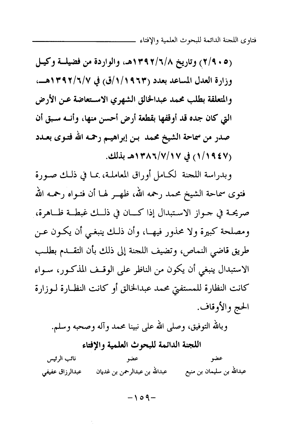 (905) وتاريخ 8 \ 6 \ 1392هـ، والواردة من فضيلة وكيل وزارة العدل المساعد بعدد (1963 \ 1 \ ق) في 7 \ 6 \ 1392هـ، والمتعلقة بطلب محمد عبد الخالق الشهري الاستعاضة عن الأرض التي كان جده قد أوقفها بقطعة أرض أحسن منها، وأنه سبق أن صدر من سماحة الشيخ محمد بن إبراهيم رحمه الله فتوى بعدد (1947 \ 1) في 17 \ 7 \ 1386هـ بذلك.