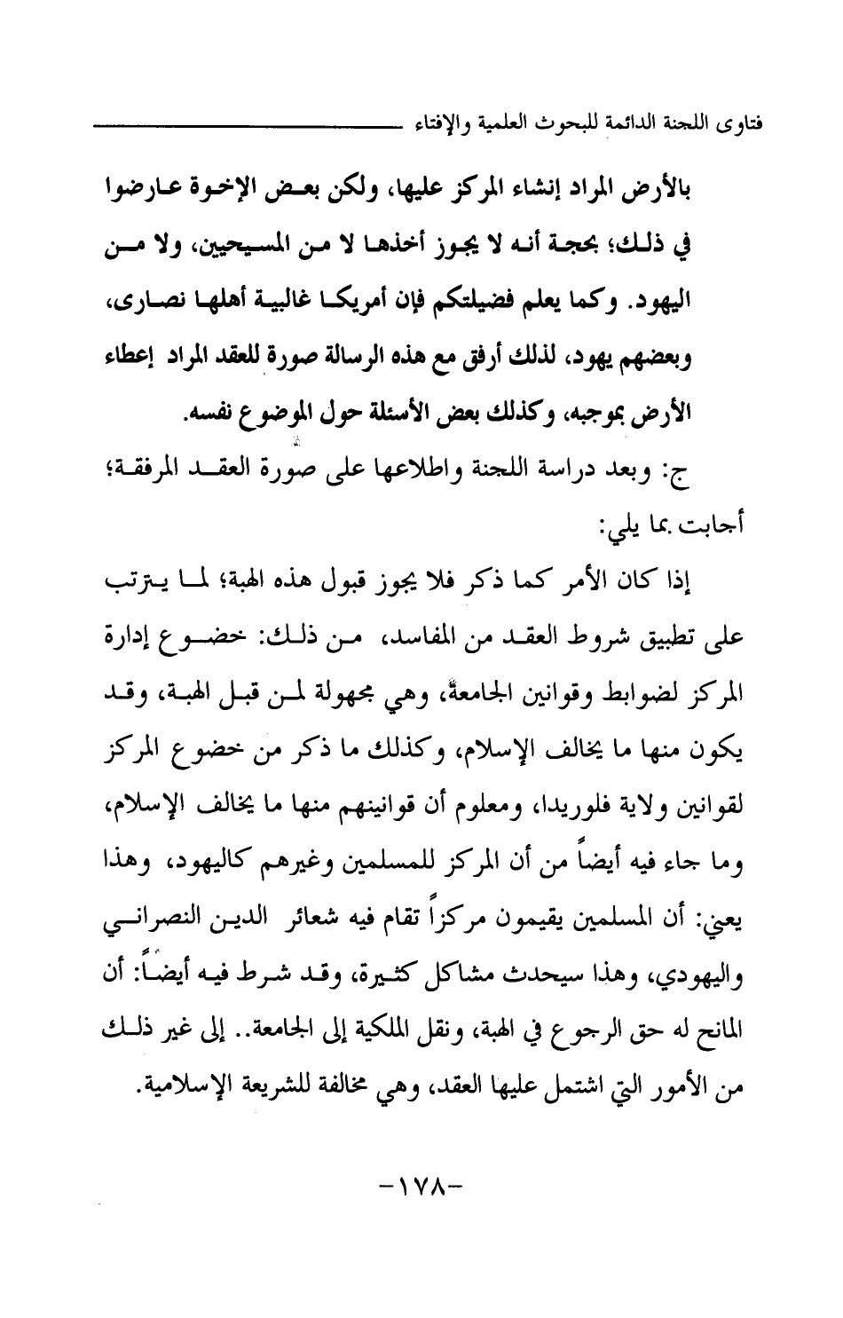 ج: وبعد دراسة اللجنة واطلاعها على صورة العقد المرفقة؛ أجابت بما يلي: إذا كان الأمر كما ذكر فلا يجوز قبول هذه الهبة؛ لما يترتب على تطبيق شروط العقد من المفاسد، من ذلك: خضوع إدارة المركز لضوابط وقوانين الجامعة، وهي مجهولة لمن قبل الهبة، وقد يكون منها ما يخالف الإسلام، وكذلك ما ذكر من خضوع المركز لقوانين ولاية فلوريدا ومعلوم أن قوانينهم منها ما يخالف الإسلام، وما جاء فيه أيضا من أن المركز للمسلمين وغيرهم كاليهود وهذا يعني: أن المسلمين يقيمون مركزا تقام فيه شعائر الدين النصراني واليهودي، وهذا سيحدث مشاكل كثيرة، وقد شرط فيه أيضا: أن المانح له حق الرجوع في الهبة، ونقل الملكية إلى الجامعة.. إلى غير ذلك من الأمور التي اشتمل عليها العقد، وهي مخالفة للشريعة الإسلامية.