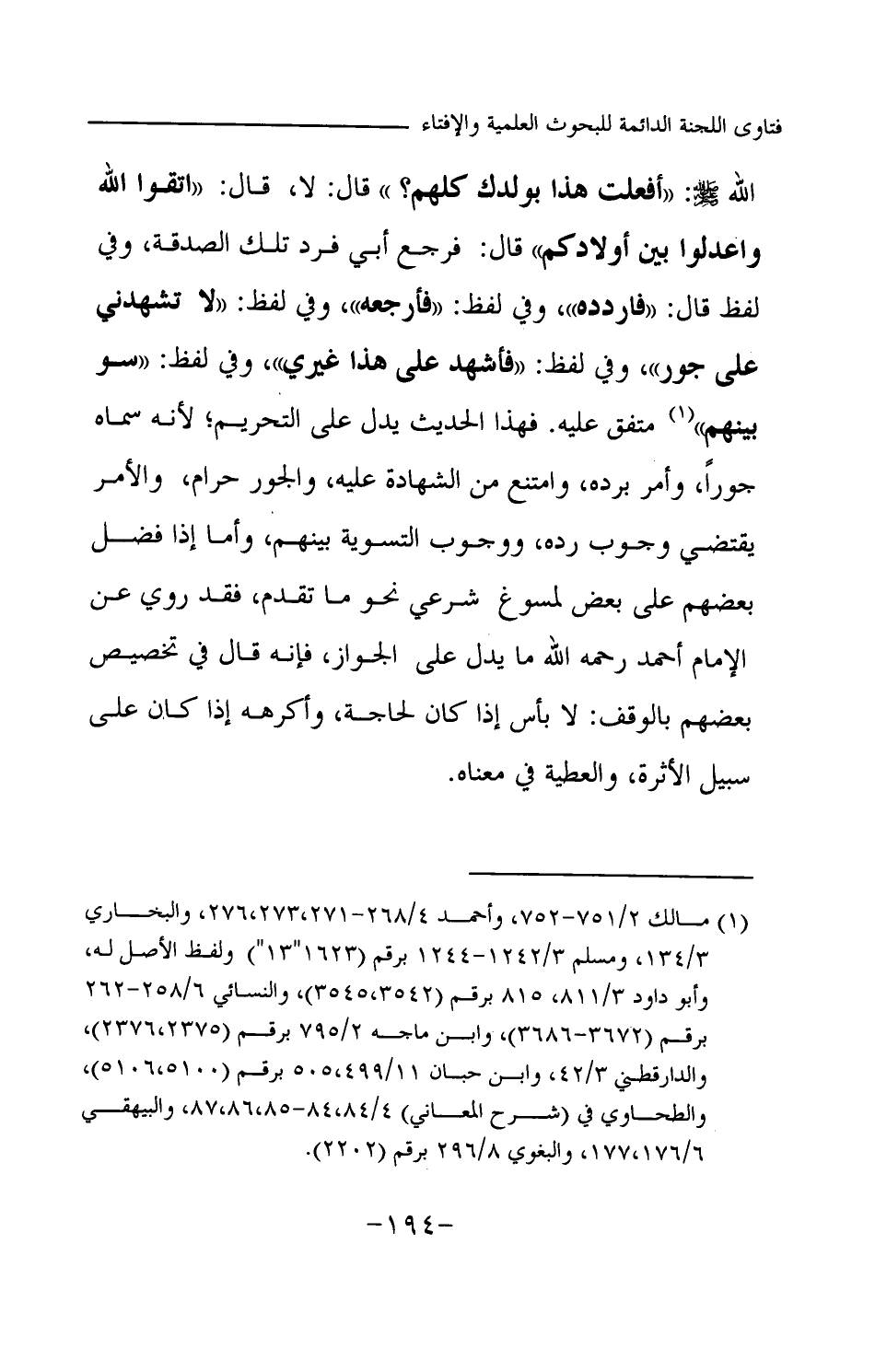 وفي لفظ قال: «فاردده» وفي لفظ: «فأرجعه» وفي لفظ: «لا تشهدني على جور» وفي لفظ: «فأشهد على هذا غيري» وفي لفظ: «سو بينهم» متفق عليه. فهذا الحديث يدل على التحريم؛ لأنه سماه جورا، وأمر برده، وامتنع من الشهادة عليه، والجور حرام، والأمر يقتضي وجوب رده، ووجوب التسوية بينهم، وأما إذا فضل بعضهم على بعض لمسوغ شرعي نحو ما تقدم، فقد روي عن الإمام أحمد رحمه الله ما يدل على الجواز، فإنه قال في تخصيص بعضهم بالوقف: لا بأس إذا كان لحاجة، وأكرهه إذا كان على سبيل الأثرة، والعطية في معناه.