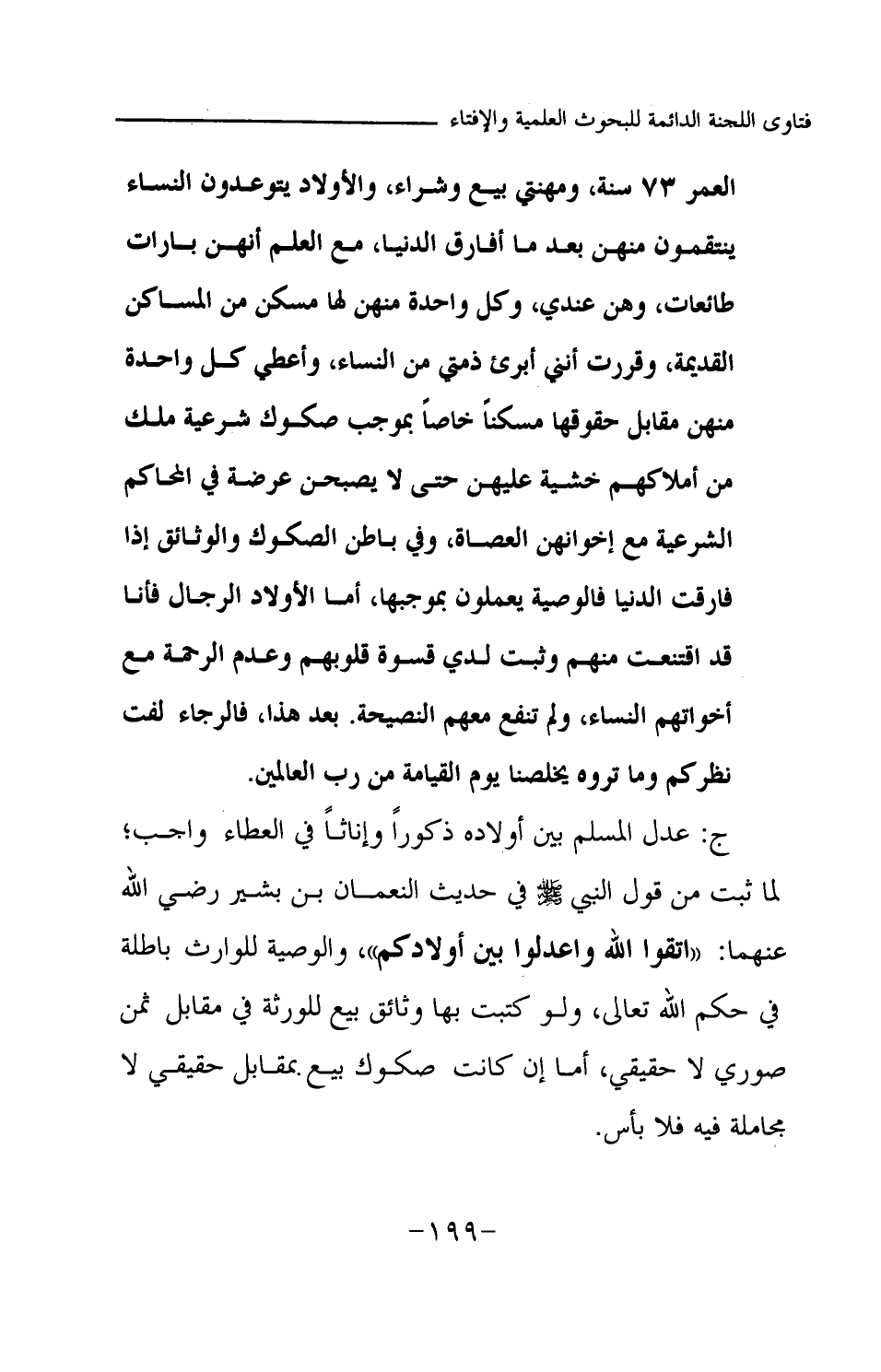 ج: عدل المسلم بين أولاده ذكورا وإناثا في العطاء واجب؛ لما ثبت من قول النبي -صلى الله عليه وسلم- في حديث النعمان بن بشير -رضي الله عنهما-: «اتقوا الله واعدلوا بين أولادكم (¬1) » والوصية للوارث باطلة في حكم الله تعالى، ولو كتبت بها وثائق بيع للورثة في مقابل ثمن صوري لا حقيقي، أما إن كانت صكوك بيع بمقابل حقيقي لا مجاملة فيه فلا بأس.