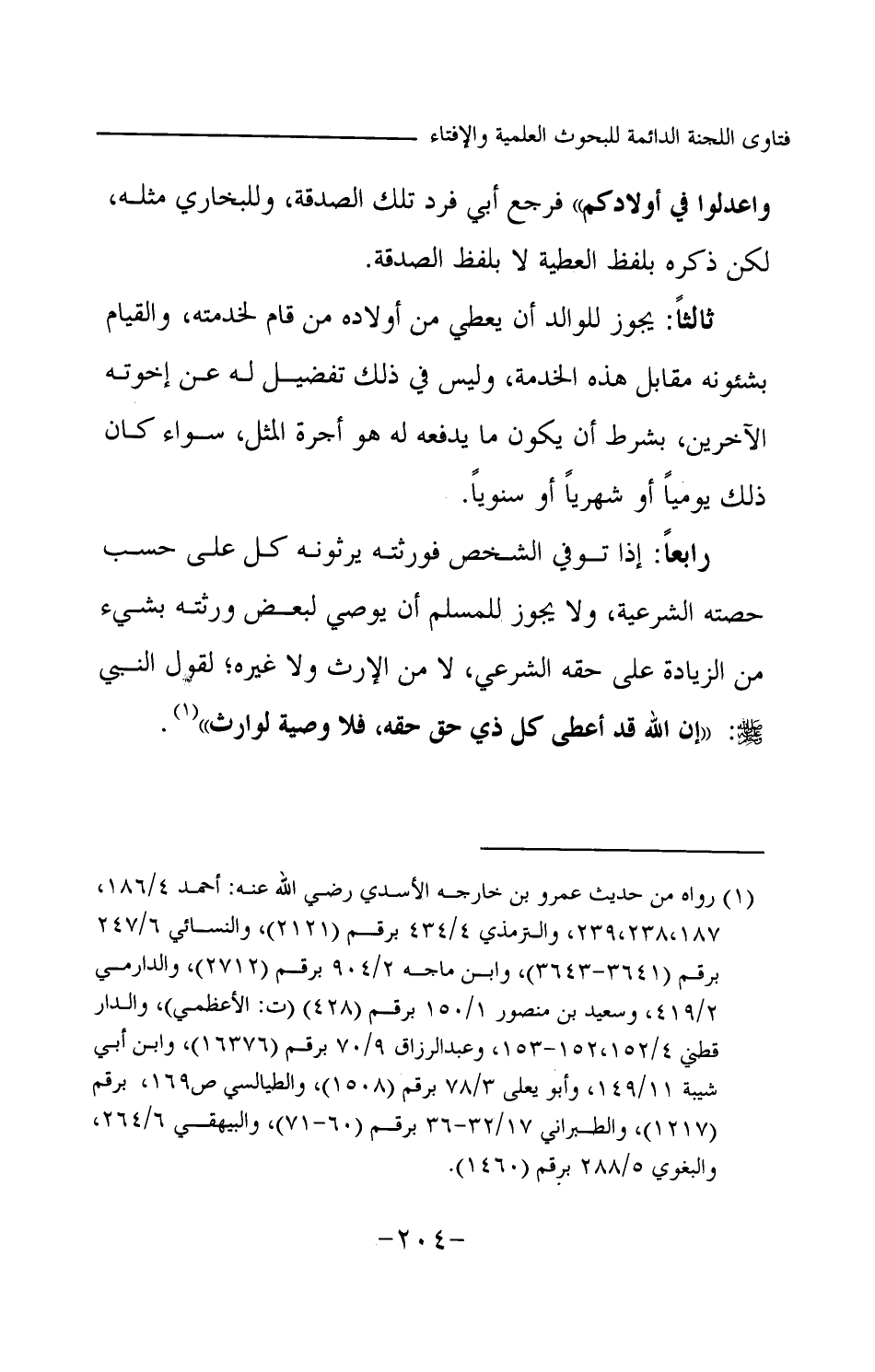 وللبخاري مثله، لكن ذكره بلفظ العطية لا بلفظ الصدقة. ثالثا: يجوز للوالد أن يعطي من أولاده من قام لخدمته، والقيام بشئونه مقابل هذه الخدمة، وليس في ذلك تفضيل له عن إخوته الآخرين، بشرط أن يكون ما يدفعه له هو أجرة المثل، سواء كان ذلك يوميا أو شهريا أو سنويا. رابعا: إذا توفي الشخص فورثته يرثونه كل على حسب حصته الشرعية، ولا يجوز للمسلم أن يوصي لبعض ورثته بشيء من الزيادة على حقه الشرعي، لا من الإرث ولا غيره، لقول النبي -صلى الله عليه وسلم-: «إن الله قد أعطى كل ذي حق حقه، فلا وصية لوارث (¬1) »