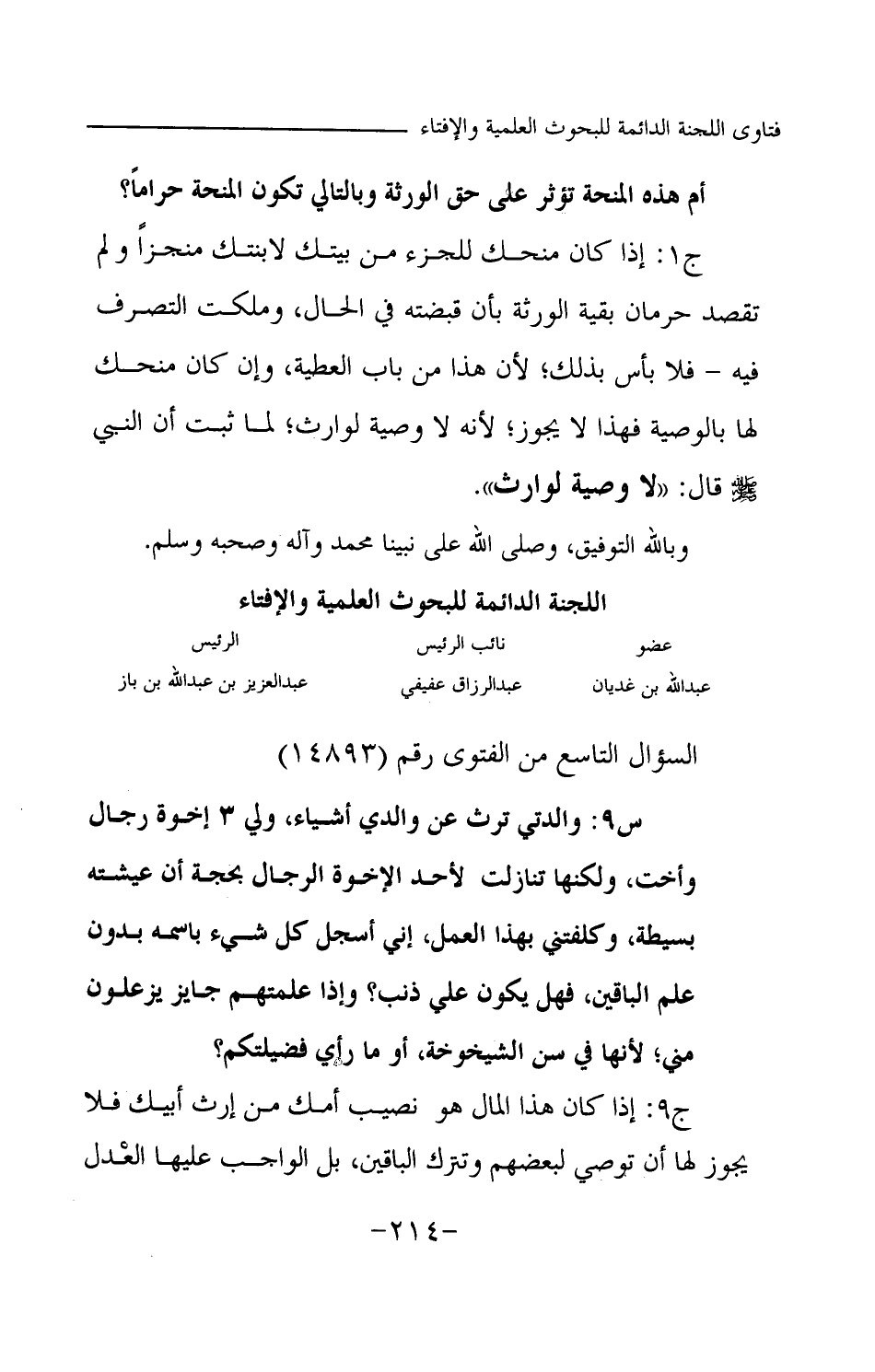 ج1: إذا كان منحك للجزء من بيتك لابنتك منجزا ولم تقصد حرمان بقية الورثة بأن قبضته في الحال، وملكت التصرف فيه- فلا بأس بذلك؛ لأن هذا من باب العطية، وإن كان منحك لها بالوصية فهذا لا يجوز؛ لأنه لا وصية لوارث، لما ثبت أن النبي -صلى الله عليه وسلم- قال: «لا وصية لوارث (¬1) » وبالله التوفيق، وصلى الله على نبينا محمد وآله وصحبه وسلم.