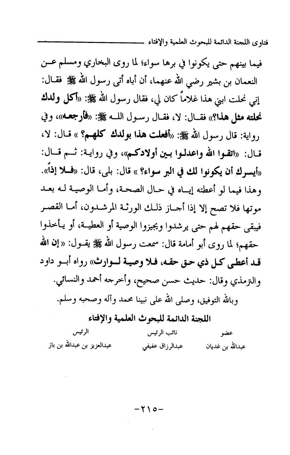 فيما بينهم حتى يكونوا في برها سواء؛ لما روى البخاري ومسلم عن النعمان بن بشير -رضي الله عنهما- «أن أباه أتى رسول الله -صلى الله عليه وسلم- فقال: إني نحلت ابني هذا غلاما كان لي، فقال رسول الله -صلى الله عليه وسلم-: أكل ولدك نحلته مثل هذا؟ فقال: لا، فقال رسول الله -صلى الله عليه وسلم-: فأرجعه (¬1) » وفي رواية: قال رسول الله -صلى الله عليه وسلم-: «أفعلت هذا بولدك كلهم؟ قال: لا، قال: اتقوا الله واعدلوا بين أولادكم (¬2) » وفي رواية: ثم قال: «أيسرك أن يكونوا لك في البر سواء؟ قال: بلى، قال: فلا إذا (¬3) » . وهذا فيما لو أعطته إياه في حال الصحة، وأما الوصية له بعد موتها فلا تصح إلا إذا أجاز ذلك الورثة المرشدون، أما القصر فيبقى حقهم لهم حتى يرشدوا ويجيزوا الوصية أو العطية، أو يأخذوا حقهم؛ لما روى أبو أمامة قال: "سمعت رسول الله -صلى الله عليه وسلم- يقول: «إن الله قد أعطى كل ذي حق حقه، فلا وصية لوارث (¬4) » رواه أبو داود والترمذي وقال: حديث حسن صحيح، وأخرجه أحمد والنسائي. وبالله التوفيق، وصلى الله على نبينا محمد وآله وصحبه وسلم.