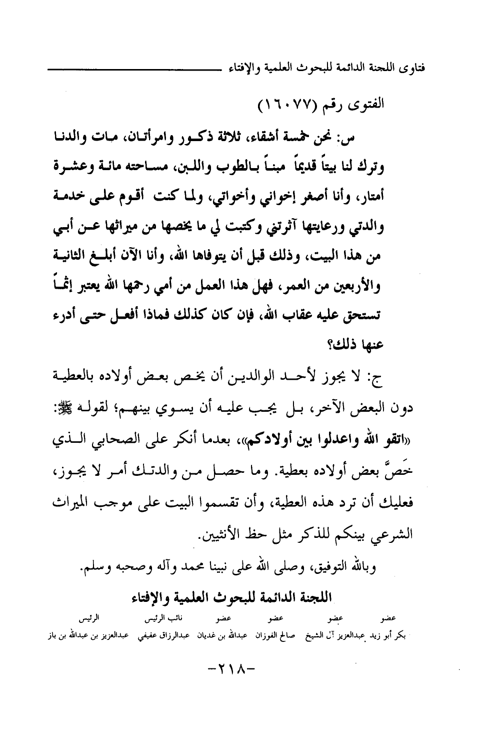 ج: لا يجوز لأحد الوالدين أن يخص بعض أولاده بالعطية دون البعض الآخر، بل يجب عليه أن يسوي بينهم؛ لقوله -صلى الله عليه وسلم-: «اتقوا الله واعدلوا بين أولادكم (¬1) » بعدما أنكر على الصحابي الذي خص بعض أولاده بعطية. وما حصل من والدتك أمر لا يجوز، فعليك أن ترد هذه العطية، وأن تقسموا البيت على موجب الميراث الشرعي بينكم للذكر مثل حظ الأنثيين. وبالله التوفيق، وصلى الله على نبينا محمد وآله وصحبه وسلم.