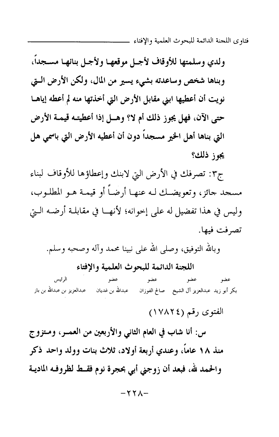 ج3: تصرفك في الأرض التي لابنك وإعطاؤها للأوقاف لبناء مسجد جائز، وتعويضك له عنها أرضا أو قيمة هو المطلوب، وليس في هذا تفضيل له على إخوانه؛ لأنها في مقابلة أرضه التي تصرفت فيها. وبالله التوفيق، وصلى الله على نبينا محمد وآله وصحبه وسلم.