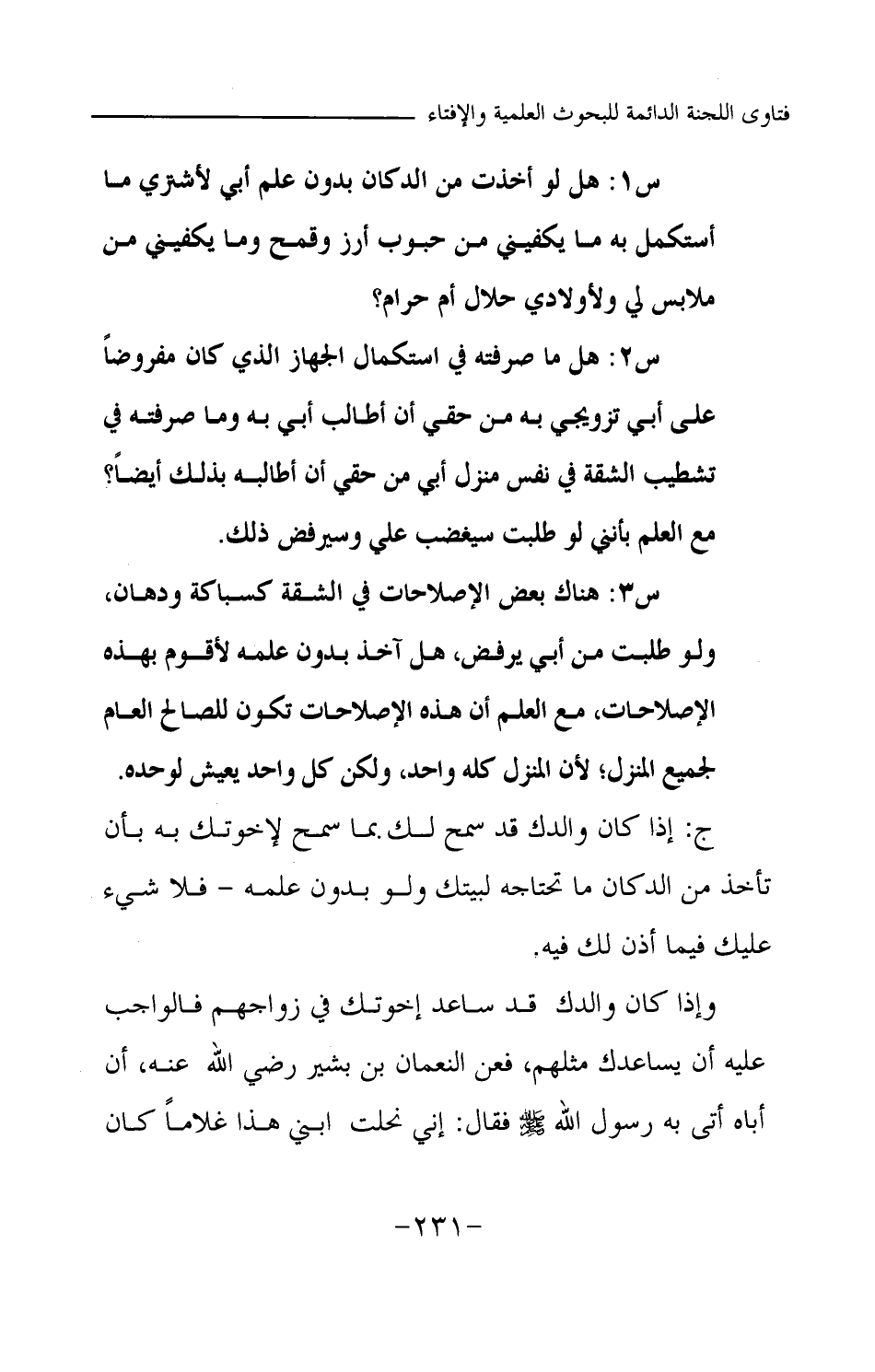 س1: هل لو أخذت من الدكان بدون علم أبي لأشتري ما أستكمل به ما يكفيني من حبوب أرز وقمح، وما يكفيني من ملابس لي ولأولادي، حلال أم حرام؟