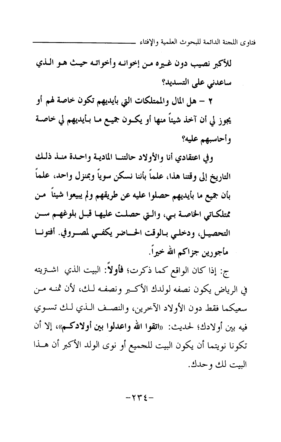ج: إذا كان الواقع كما ذكرت؟ فأولا: البيت الذي اشتريته في الرياض يكون نصفه لولدك الأكبر ونصفه لك؛ لأن ثمنه من سعيكما فقط دون الأولاد الآخرين، والنصف الذي لك تسوي فيه بين أولادك؛ لحديث: «اتقوا الله واعدلوا بين أولادكم (¬1) » إلا أن تكونا نويتما أن يكون البيت للجميع أو نوى الولد الأكبر أن هذا البيت لك وحدك. ثانيا: