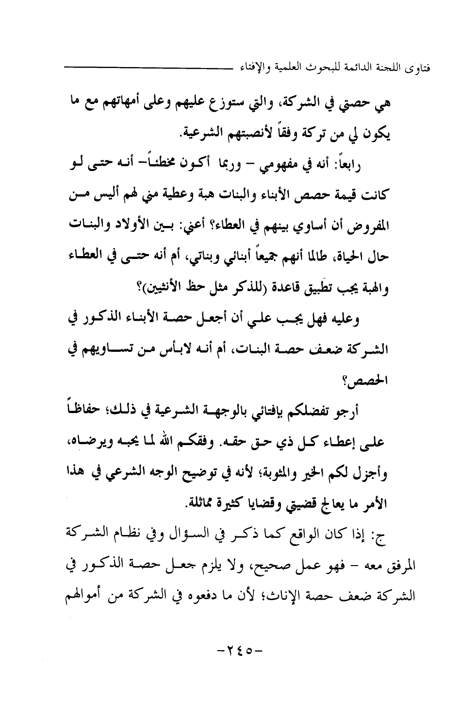 ج: إذا كان الواقع كما ذكر في السؤال وفي نظام الشركة المرفق معه- فهو عمل صحيح، ولا يلزم جعل حصة الذكور في الشركة ضعف حصة الإناث؛ لأن ما دفعوه في الشركة من أموالهم