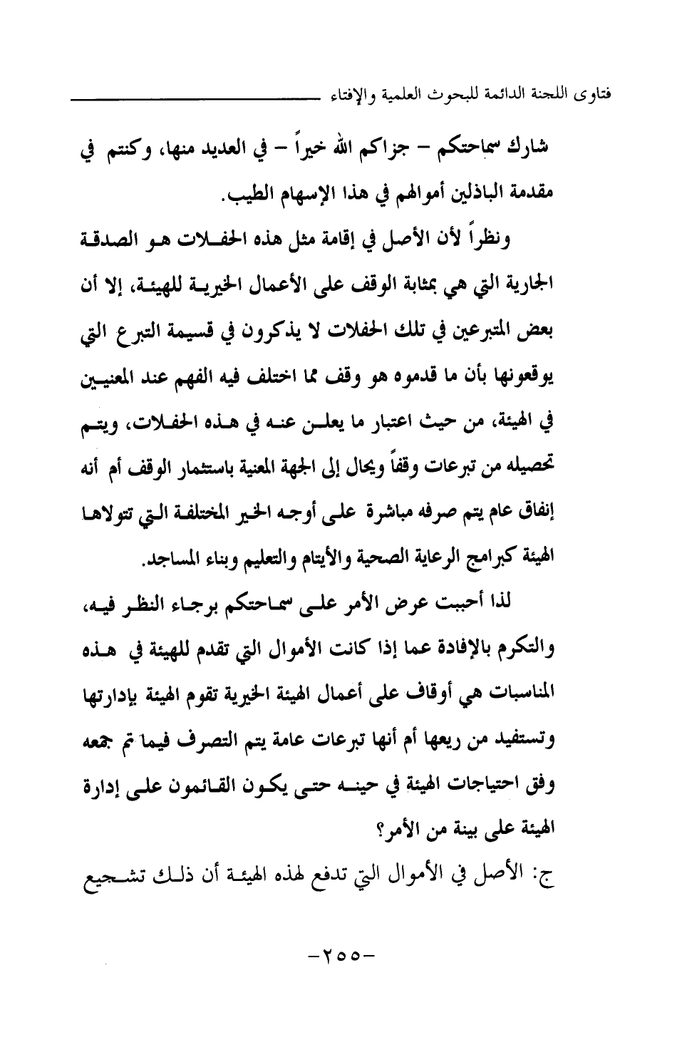 لذا أحببت عرض الأمر على سماحتكم برجاء النظر فيه، والتكرم بالإفادة عما إذا كانت الأموال التي تقدم للهيئة في هذه المناسبات هي أوقاف على أعمال الهيئة الخيرية تقوم الهيئة بإدارتها وتستفيد من ريعها أم أنها تبرعات عامة يتم التصرف فيما تم جمعه وفق احتياجات الهيئة في حينه حتى يكون القائمون على إدارة الهيئة على بينة من الأمر؟