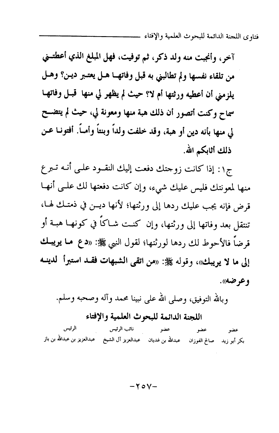 ج1: إذا كانت زوجتك دفعت إليك النقود على أنه تبرع منها لمعونتك، فليس عليك شيء، وإن كانت دفعتها لك على أنها قرض، فإنه يجب عليك ردها إلى ورثتها؛ لأنها دين في ذمتك لها، تنتقل بعد وفاتها إلى ورثتها، وإن كنت شاكا في كونها هبة أو قرضا، فالأحوط لك ردها لورثتها؛ لقول النبي -صلى الله عليه وسلم-: «دع ما يريبك إلى ما لا يريبك (¬1) » وقوله -صلى الله عليه وسلم-: «من اتقى الشبهات فقد استبرأ لدينه وعرضه (¬2) » وبالله التوفيق، وصلى الله على نبينا محمد وآله وصحبه وسلم.