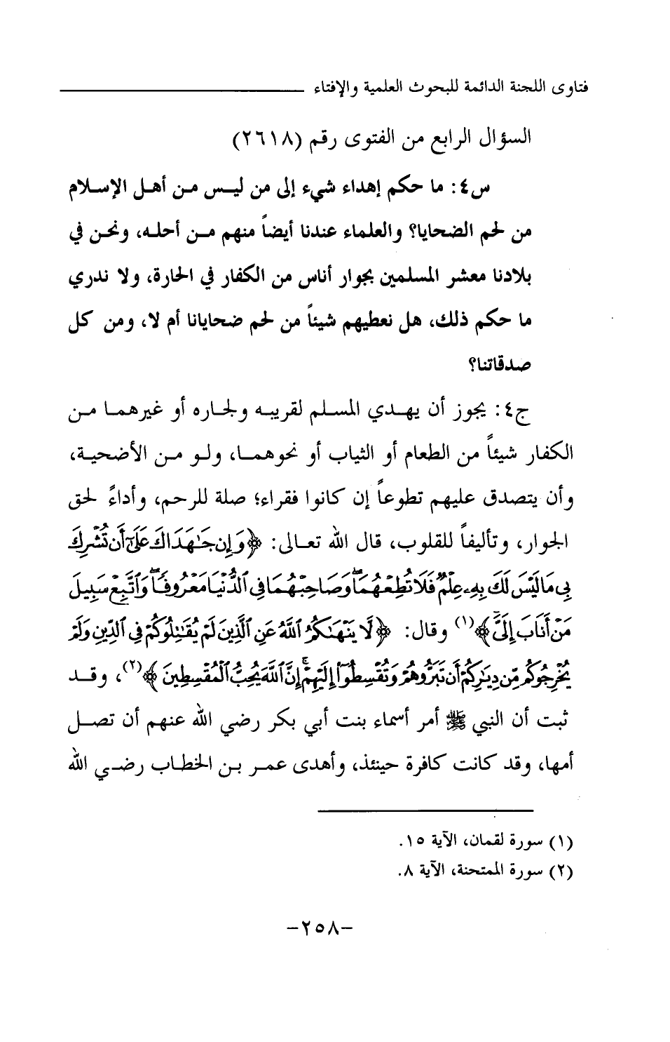 ج 4: يجوز أن يهدي المسلم لقريبه ولجاره أو غيرهما من الكفار شيئا من الطعام أو الثياب أو نحوهما، ولو من الأضحية، وأن يتصدق عليهم تطوعا إن كانوا فقراء؛ صلة للرحم، وأداء لحق الجوار، وتأليفا للقلوب، قال الله تعالى: {وَإِنْ جَاهَدَاكَ عَلى أَنْ تُشْرِكَ بِي مَا لَيْسَ لَكَ بِهِ عِلْمٌ فَلَا تُطِعْهُمَا وَصَاحِبْهُمَا فِي الدُّنْيَا مَعْرُوفًا وَاتَّبِعْ سَبِيلَ مَنْ أَنَابَ إِلَيَّ} (¬1) وقال: {لَا يَنْهَاكُمُ اللَّهُ عَنِ الَّذِينَ لَمْ يُقَاتِلُوكُمْ فِي الدِّينِ وَلَمْ يُخْرِجُوكُمْ مِنْ دِيَارِكُمْ أَنْ تَبَرُّوهُمْ وَتُقْسِطُوا إِلَيْهِمْ إِنَّ اللَّهَ يُحِبُّ الْمُقْسِطِينَ} (¬2) وقد ثبت أن النبي -صلى الله عليه وسلم- أمر أسماء بنت أبي بكر رضي الله عنهم أن تصل أمها، وكانت كافرة حينئذ، وأهدى عمر بن الخطاب رضي الله