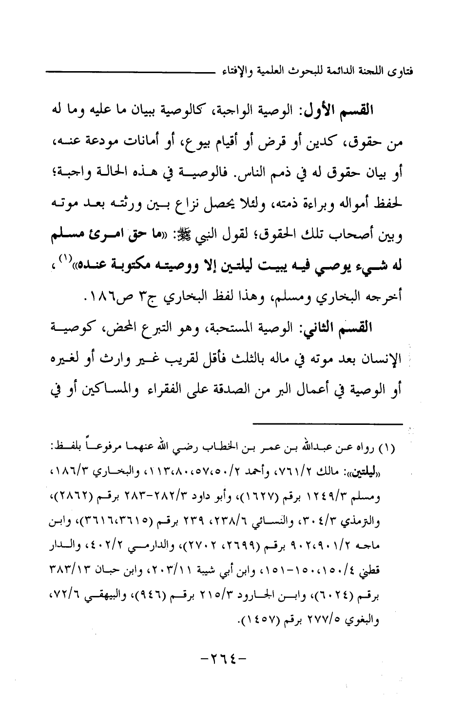 القسم الأول: الوصية الواجبة، كالوصية ببيان ما عليه وما له من حقوق، كدين أو قرض أو أقيام بيوع، أو أمانات مودعة عنده، أو بيان حقوق له في ذمم الناس. فالوصية في هذه الحالة واجبة، لحفظ أمواله وبراءة ذمته، ولئلا يحصل نزاع بين ورثته بعد موته وبين أصحاب تلك الحقوق، لقول النبي -صلى الله عليه وسلم-: «ما حق امرئ مسلم له شيء يوصي فيه يبيت ليلتين إلا ووصيته مكتوبة عنده (¬1) » أخرجه البخاري ومسلم، وهذا لفظ البخاري ج 3 ص 186. القسم الثاني: الوصية المستحبة، وهو التبرع المحض، كوصية الإنسان بعد موته في ماله بالثلث فأقل لقريب غير وارث أو لغيره أو الوصية في أعمال البر من الصدقة على الفقراء والمساكين أو في