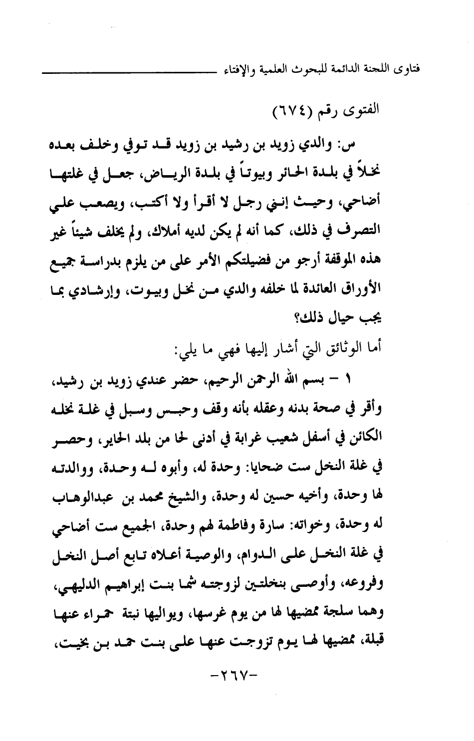 1 - بسم الله الرحمن الرحيم، حضر عندي زويد بن رشيد، وأقر في صحة بدنه وعقله بأنه وقف وحبس وسبل في غلة نخله الكائن في أسفل شعيب غرابة في أدنى لحا من بلد الحاير وحصر في غلة النخل ست ضحايا: وحدة له، وأبوه له وحدة، ووالدته لها وحدة، وأخيه حسين له وحدة، والشيخ محمد بن عبد الوهاب له وحدة، وخواته: سارة وفاطمة لهم وحدة. الجميع ست أضاحي في غلة النخل على الدوام، والوصية أعلاه تابع أصل النخل وفروعه، وأوصى بنخلتين لزوجته شما بنت إبراهيم الدليهي، وهما سلجة ممضيها لها من يوم غرسها، ويواليها نبتة حمراء عنها قبلة، ممضيها لها يوم تزوجت عنها على بنت حمد بن بخيت،