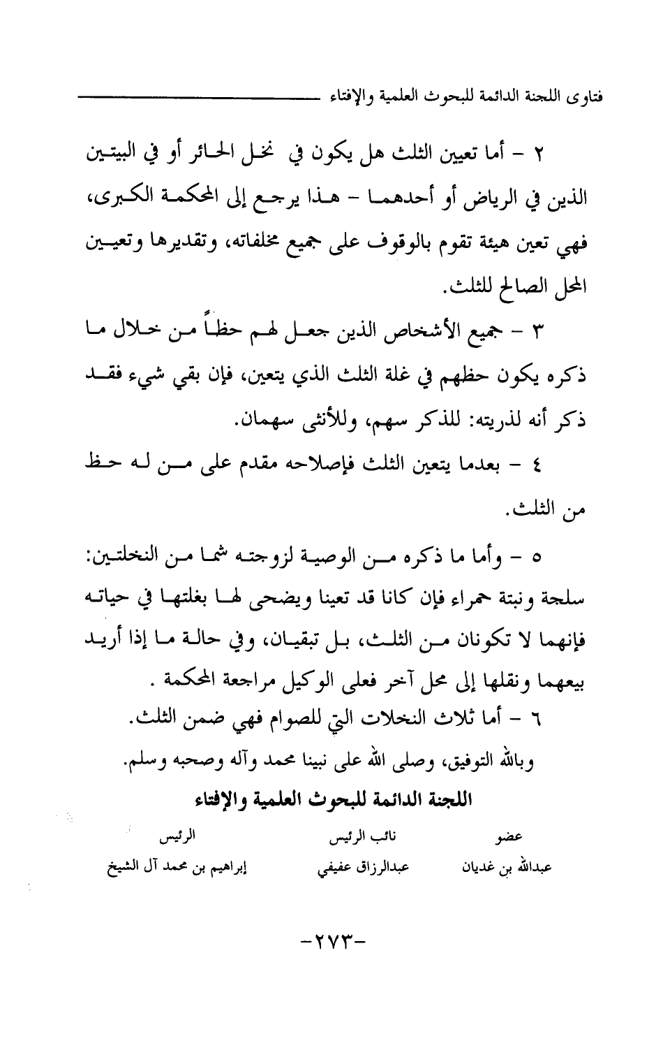 2 - أما تعيين الثلث هل يكون في نخل الحائر أو في البيتين اللذين في الرياض أو أحدهما - هذا يرجع إلى المحكمة الكبرى، فهي تعين هيئة تقوم بالوقوف على جميع مخلفاته، وتقديرها وتعيين المحل الصالح للثلث. 3 - جميع الأشخاص الذين جعل لهم حظا من خلال ما ذكره يكون حظهم في غلة الثلث الذي يتعين، فإن بقي شيء فقد ذكر أنه لذريته: للذكر سهم، وللأنثى سهمان. 4 - بعدما يتعين الثلث فإصلاحه مقدم على من له حظ من الثلث. 5 - وأما ما ذكره من الوصية لزوجته شما من النخلتين: سلجة ونبتة حمراء فإن كانا قد تعينا ويضحى لها بغلتها في حياته فإنهما لا تكونان من الثلث، بل تبقيان، وفي حالة ما إذا أريد بيعهما ونقلها إلى محل آخر فعلى الوكيل مراجعة المحكمة. 6 - أما ثلاث النخلات التي للصوام فهي ضمن الثلث. وبالله التوفيق، وصلى الله على نبينا محمد وآله وصحبه وسلم.