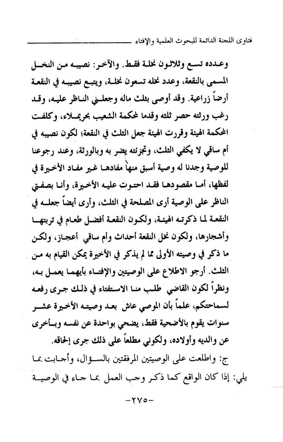 وعدده تسع وثلاثون نخلة فقط. والآخر: نصيبه من النخل المسمى بالنقعة، وعدد نخله تسعون نخلة، ويتبع نصيبه في النقعة أرضا زراعية. وقد أوصى بثلث ماله وجعلني الناظر عليه، وقد رغب ورثته حصر ثلثه وقدما لمحكمة الشعيب بحريملاء وكلفت المحكمة الهيئة وقررت الهيئة جعل الثلث في النقعة؛ لكون نصيبه في أم ساقي لا يكفي الثلث، وتجزئته يضر به وبالورثة، وعند رجوعنا للوصية وجدنا له وصية أسبق منها مفادها غير مفاد الأخيرة في لفظها، أما مقصودها فقد احتوت عليه الأخيرة، وأنا بصفتي الناظر على الوصية أرى المصلحة في الثلث، وأرى أيضا جعله في النقعة لما ذكرته الهيئة، ولكون النقعة أفضل طعام في تربتها وأشجارها، ولكون نخل النقعة أحداث وأم ساقي أعجاز، ولكن ما ذكر في وصيته الأولى مما لم يذكر في الأخيرة يمكن القيام به من الثلث. أرجو الاطلاع على الوصيتين والإفتاء بأيهما يعمل به، ونظرا لكون القاضي طلب منا الاستفتاء في ذلك جرى رفعه لسماحتكم، علما بأن الموصي عاش بعد وصيته الأخيرة عشر سنوات يقوم بالأضحية فقط، يضحي بواحدة عن نفسه وبأخرى عن والديه وأولاده، ولكوني مطلعا على ذلك جرى إلحاقه.