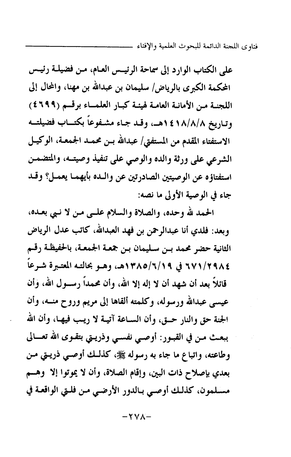 فلدي أنا عبد الرحمن بن فهد العبد الله، كاتب عدل الرياض الثانية حضر محمد بن سليمان بن جمعة الجمعة، بالحفيظة رقم 2984 \ 671 \ في 19 \ 6 \ 1385هـ، وهو بحالته المعتبرة شرعا قائلا بعد أن شهد أن لا إله إلا الله، وأن محمدا رسول الله، وأن عيسى عبد الله ورسوله، وكلمته ألقاها إلى مريم وروح منه، وأن الجنة حق والنار حق، وأن الساعة آتية لا ريب فيها، وأن الله يبعث من في القبور: أوصي نفسي وذريتي بتقوى الله تعالى وطاعته، واتباع ما جاء به رسوله -صلى الله عليه وسلم-، كذلك أوصي ذريتي من بعدي بإصلاح ذات البين، وإقام الصلاة، وأن لا يموتوا إلا وهم مسلمون، كذلك أوصي بالدور الأرضي من فلتي الواقعة في