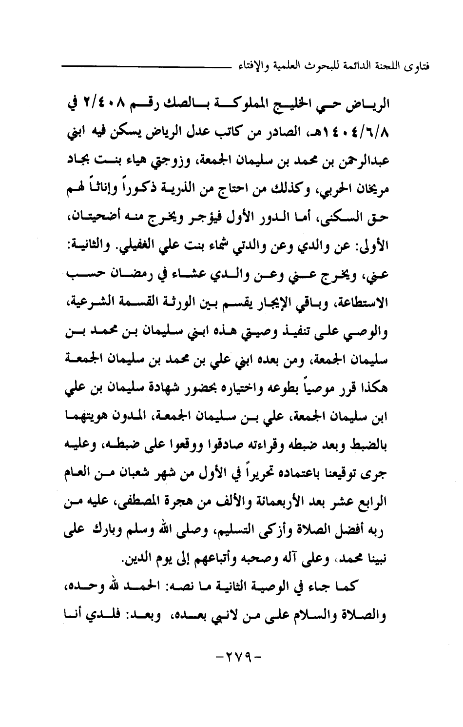 الرياض حي الخليج المملوكة بالصك رقم 408 \ 2 في 8 \ 6 \ 1404هـ، الصادر من كاتب عدل الرياض يسكن فيه ابني عبد الرحمن بن محمد بن سليمان الجمعة، وزوجتي هياء بنت بجاد مريخان الحربي، وكذلك من احتاج من الذرية ذكورا وإناثا لهم حق السكنى، أما الدور الأول فيؤجر ويخرج منه أضحيتان، الأولى: عن والدي وعن والدتي شماء بنت علي الغفيلي. والثانية: عني، ويخرج عني وعن والدي عشاء في رمضان حسب الاستطاعة، وباقي الإيجار يقسم بين الورثة القسمة الشرعية، والوصي على تنفيذ وصيتي هذه ابني سليمان بن محمد بن سليمان الجمعة، ومن بعده ابني علي بن محمد بن سلمان الجمعة هكذا قرر موصيا بطوعه واختياره بحضور شهادة سلمان بن علي بن سليمان الجمعة، علي بن سليمان الجمعة، المدون هويتهما بالضبط وبعد ضبطه وقراءته صادقوا ووقعوا على ضبطه، وعليه جرى توقيعنا باعتماده تحريرا في الأول من شهر شعبان من العام الرابع عشر بعد الأربعمائة والألف من هجرة المصطفى، عليه من ربه أفضل الصلاة وأزكى التسليم، وصلى الله وسلم وبارك على نبينا محمد وعلى آله وصحبه وأتباعهم إلى يوم الدين.