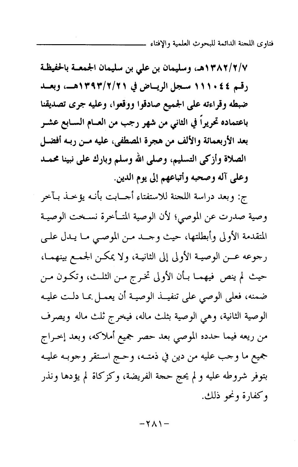 هـ، وسليمان بن علي بن سليمان الجمعة بالحفيظة رقم 111044 سجل الرياض في 21 \ 2 \ 1393هـ، وبعد ضبطه وقراءته على الجميع صادقوا ووقعوا، وعليه جرى تصديقنا باعتماده تحريرا في الثاني من شهر رجب من العام السابع عشر بعد الأربعمائة والألف من هجرة المصطفى، عليه من ربه أفضل الصلاة وأزكى التسليم، وصلى الله وسلم وبارك على نبينا محمد وعلى آله وصحبه وأتباعهم إلى يوم الدين.
