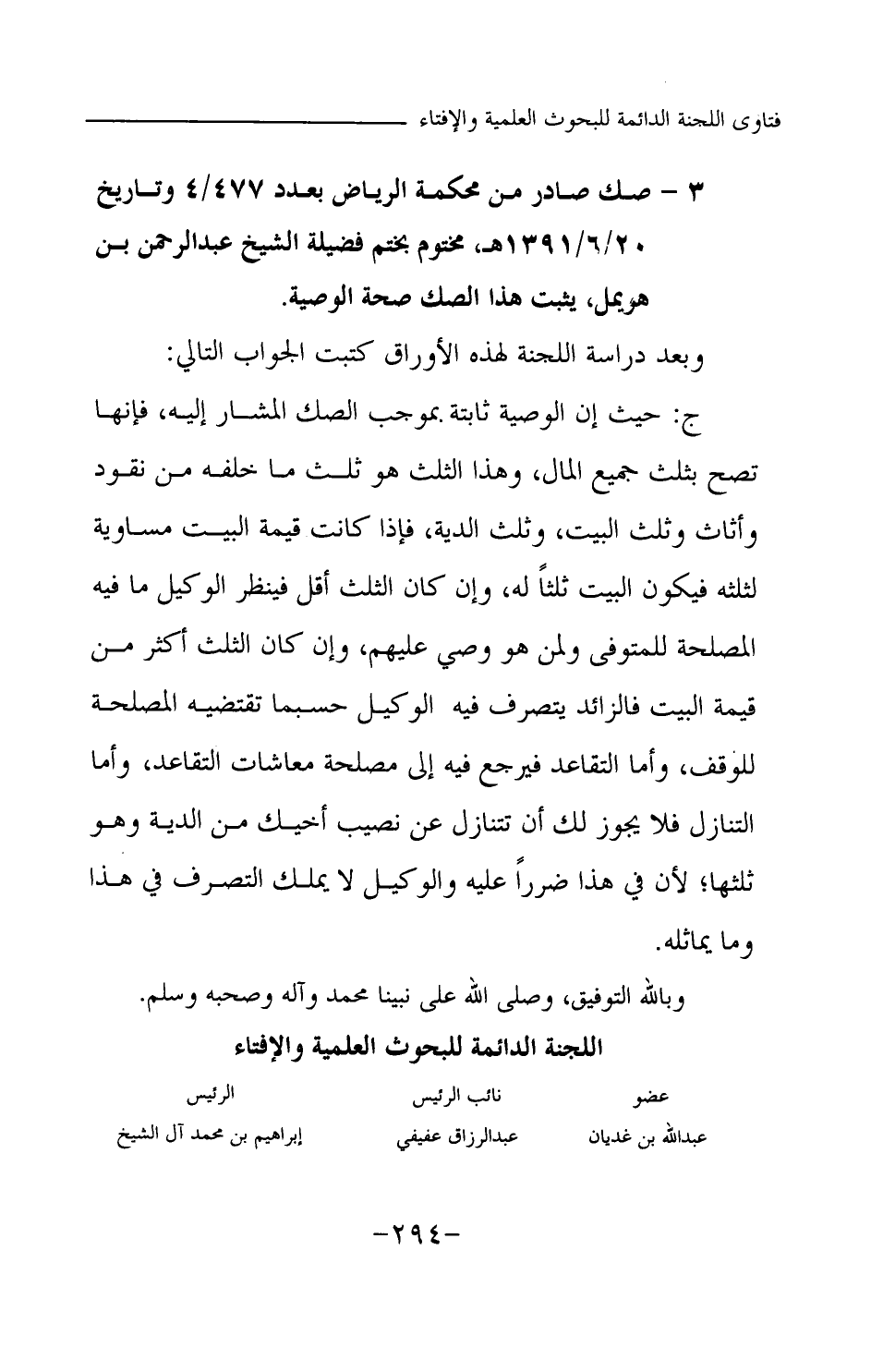 صك صادر من محكمة الرياض بعدد 477 \ 4 وتاريخ 20 \ 6 \ 1391هـ، مختوم بختم فضيلة الشيخ عبد الرحمن بن هويمل يثبت هذا الصك صحة الوصية.