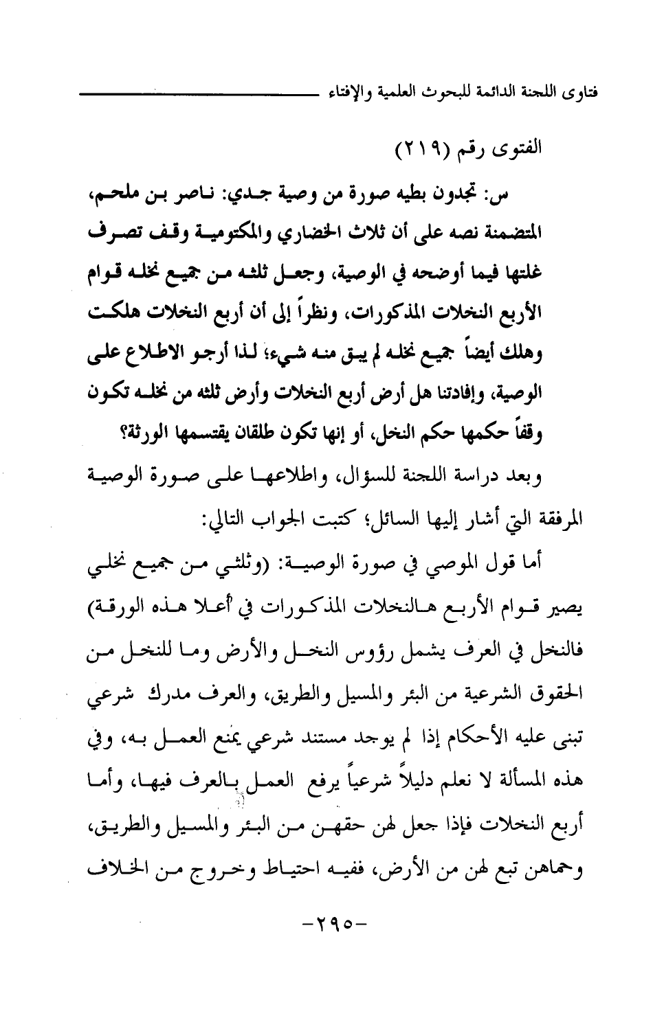 وبعد دراسة اللجنة للسؤال، واطلاعها على صورة الوصية المرفقة التي أشار إليها السائل؟ كتبت الجواب التالي: أما قول الموصى في صورة الوصية: (وثلثي من جميع نخلي يصير قوام الأربع هالنخلات المذكورات في أعلى هذه الورقة) فالنخل في العرف يشمل رؤوس النخل والأرض وما للنخل من الحقوق الشرعية من البئر والمسيل والطريق، والعرف مدرك شرعي تبنى عليه الأحكام إذا لم يوجد مستند شرعي يمنع العمل به، وفي هذه المسألة لا نعلم دليلا شرعيا يرفع العمل بالعرف فيها، وأما أربع النخلات فإذا جعل لهن حقهن من البئر والمسيل والطريق، وحماهن تبع لهن من الأرض، ففيه احتياط وخروج من الخلاف