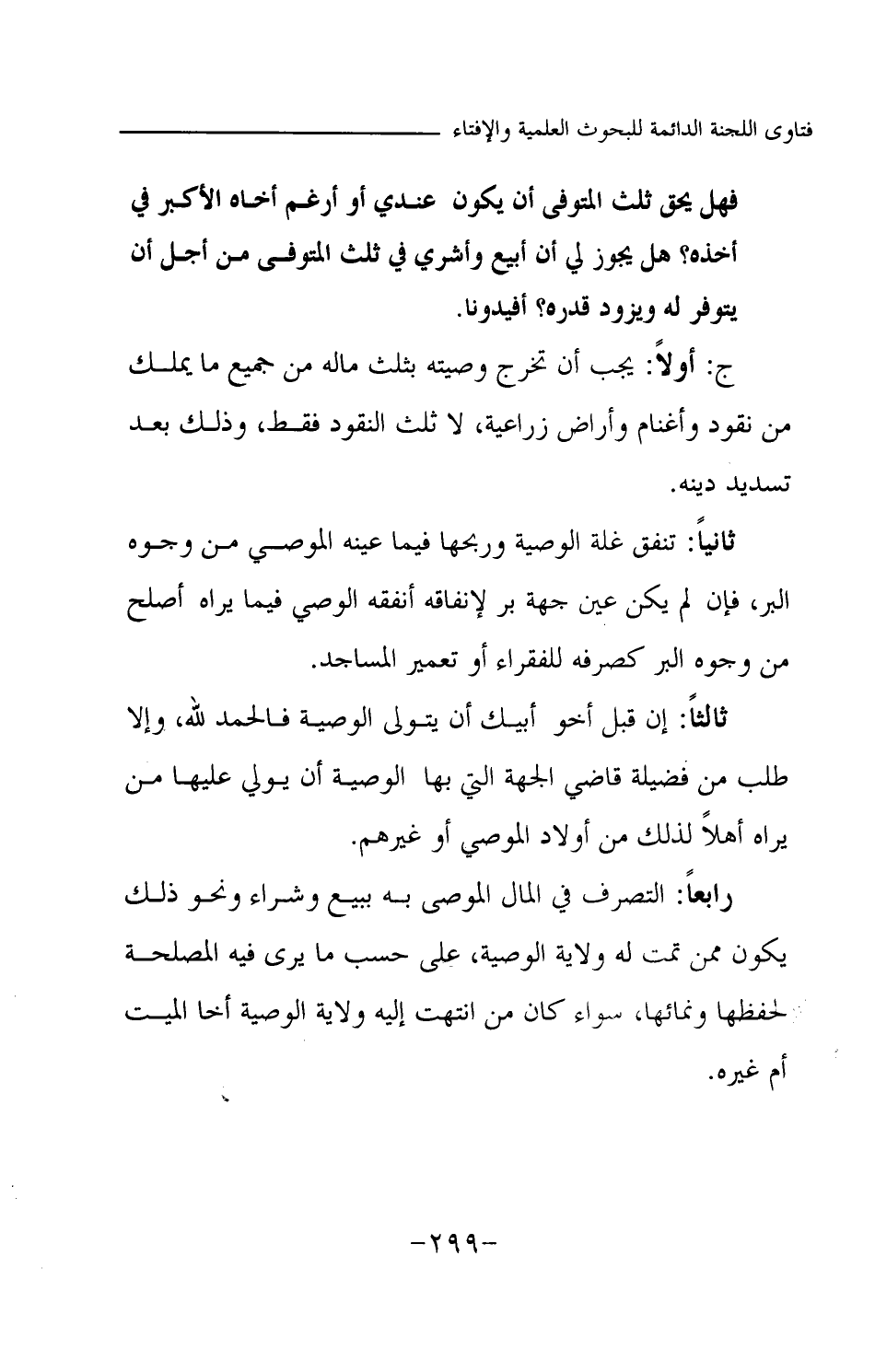 ج: أولا: يجب أن تخرج وصيته بثلث ماله من جميع ما يملك من نقود وأغنام وأراض زراعية، لا ثلث النقود فقط، وذلك بعد تسديد دينه. ثانيا: تنفق غلة الوصية وربحها فيما عينه الموصي من وجوه البر، فإن لم يكن عين جهة بر لإنفاقه أنفقه الوصي فيما يراه أصلح من وجوه البر كصرفه للفقراء أو تعمير المساجد. ثالثا: إن قبل أخو أبيك أن يتولى الوصية فالحمد لله، وإلا طلب من فضيلة قاضي الجهة التي بها الوصية أن يولي عليها من يراه أهلا لذلك من أولاد الموصي أو غيرهم. رابعا: التصرف في المال الموصى به ببيع وشراء ونحو ذلك يكون ممن تمت له ولاية الوصية، على حسب ما يرى فيه المصلحة لحفظها ونمائها، سواء كان من انتهت إليه ولاية الوصية أخا الميت أم غيره.