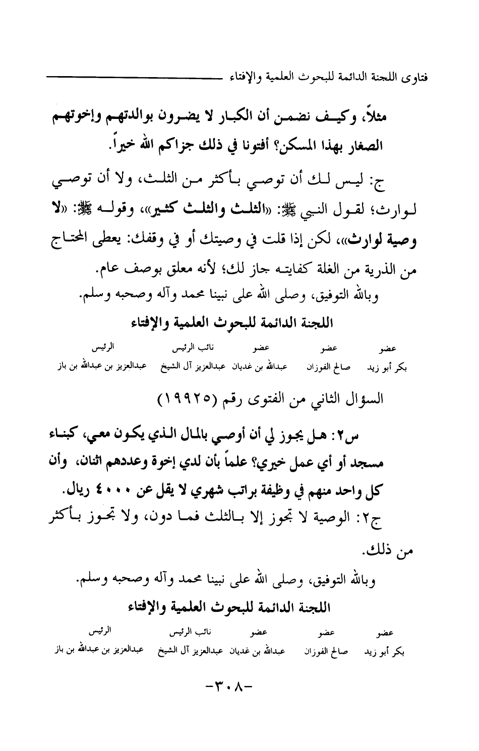 ج: ليس لك أن توصي بأكثر من الثلث، ولا أن توصي لوارث؛ لقول النبي -صلى الله عليه وسلم-: «الثلث والثلث كثير (¬1) » وقوله -صلى الله عليه وسلم-: «لا وصية لوارث (¬2) » لكن إذا قلت في وصيتك أو في وقفك: يعطى المحتاج من الذرية من الغلة كفايته جاز لك؛ لأنه معلق بوصف عام. وبالله التوفيق، وصلى الله على نبينا محمد وآله وصحبه وسلم.