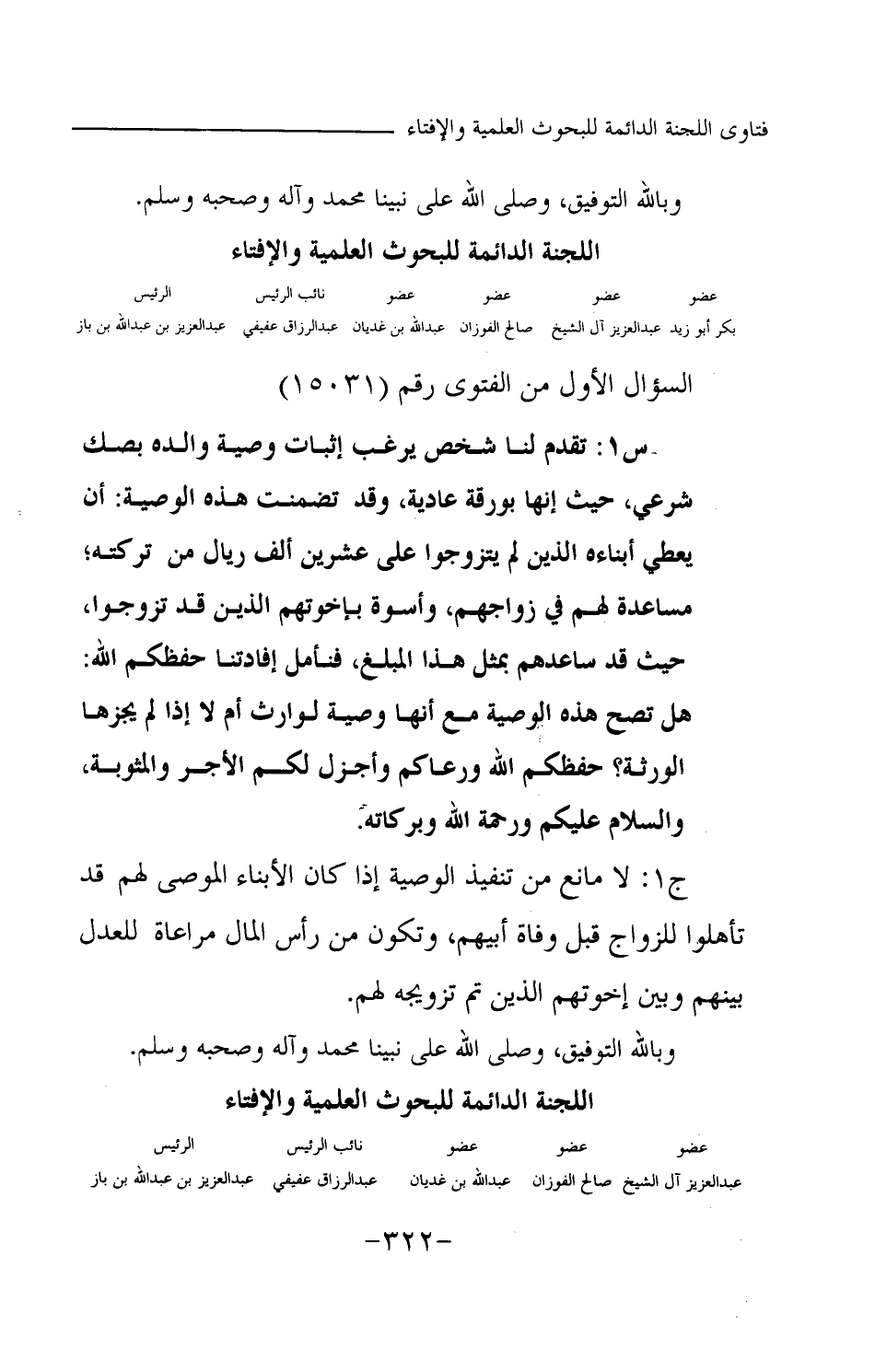 س1: تقدم لنا شخص يرغب إثبات وصية والده بصك شرعي، حيث إنها بورقة عادية، وقد تضمنت هذه الوصية: أن يعطي أبناءه الذين لم يتزوجوا على عشرين ألف ريال من تركته، مساعدة لهم في زواجهم، وأسوة بإخوتهم الذين قد تزوجوا، حيث قد ساعدهم بمثل هذا المبلغ، فنأمل إفادتنا حفظكم الله: