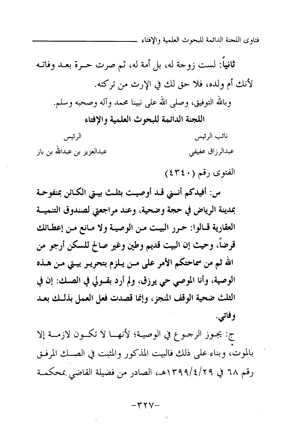 ج: يجوز الرجوع في الوصية؛ لأنها لا تكون لازمة إلا بالموت، وبناء على ذلك فالبيت المذكور والمثبت في الصك المرفق رقم 68 في 29 \ 4 \ 1399 هـ، الصادر من فضيلة القاضي