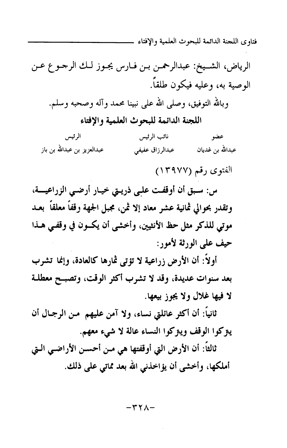 س: سبق أن أوقفت على ذريتي خيار أرضي الزراعية، وتقدر بحوالي ثمانية عشر معاد إلا ثمن، مجبل الجهة وقفا معلقا بعد موتي للذكر مثل حظ الأنثيين، وأخشى أن يكون في وقفي هذا حيف على الورثة لأمور: