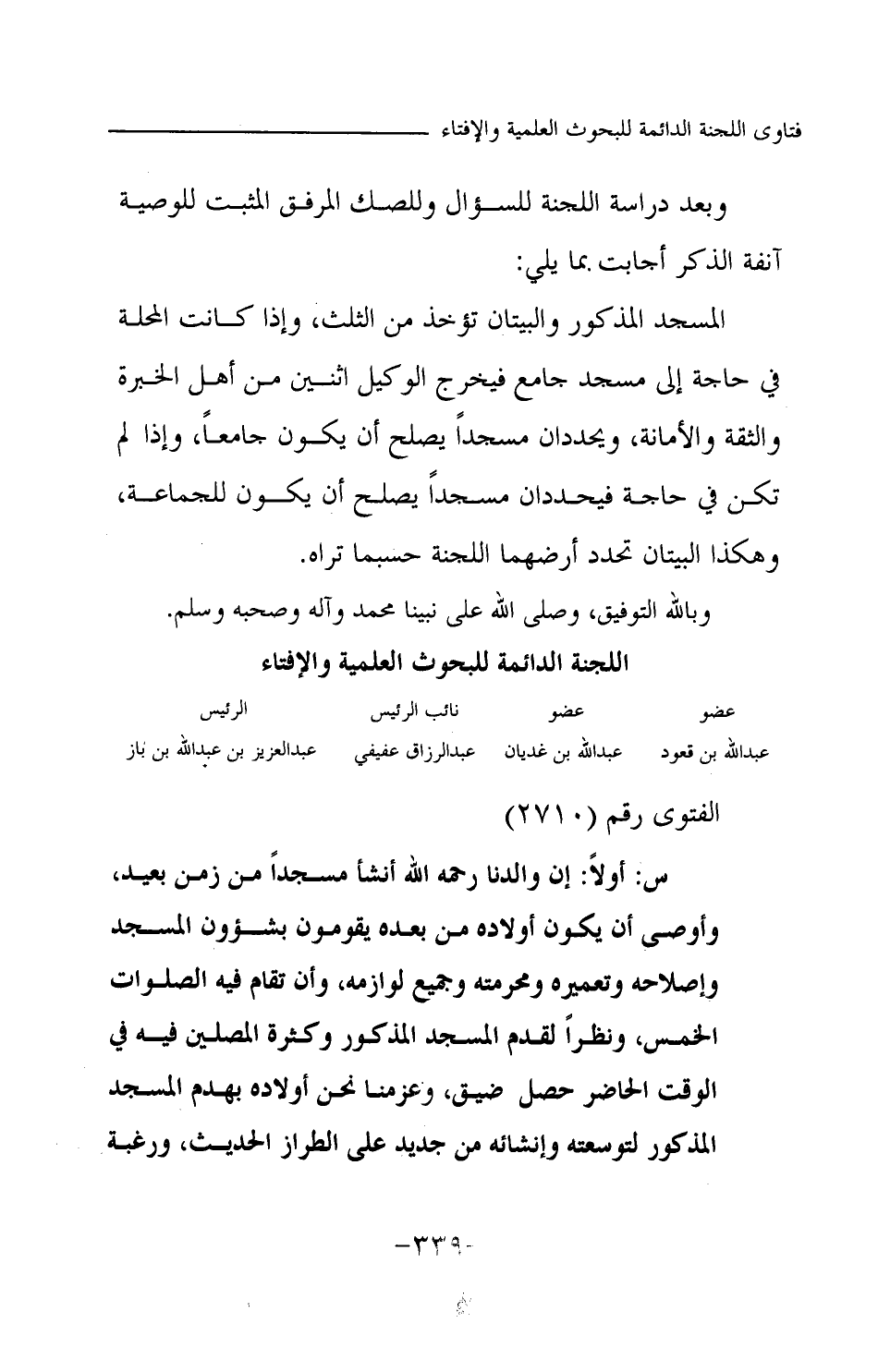 وبعد دراسة اللجنة للسؤال وللصك المرفق المثبت للوصية آنفة الذكر أجابت بما يلي: المسجد المذكور والبيتان تؤخذ من الثلث، وإذا كانت المحلة في حاجة إلى مسجد جامع فيخرج الوكيل اثنين من أهل الخبرة والثقة والأمانة، ويحددان مسجدا يصلح أن يكون جامعا، وإذا لم تكن في حاجة فيحددان مسجدا يصلح أن يكون للجماعة، وهكذا البيتان تحدد أرضهما اللجنة حسبما تراه. وبالله التوفيق، وصلى الله على نبينا محمد وآله وصحبه وسلم.