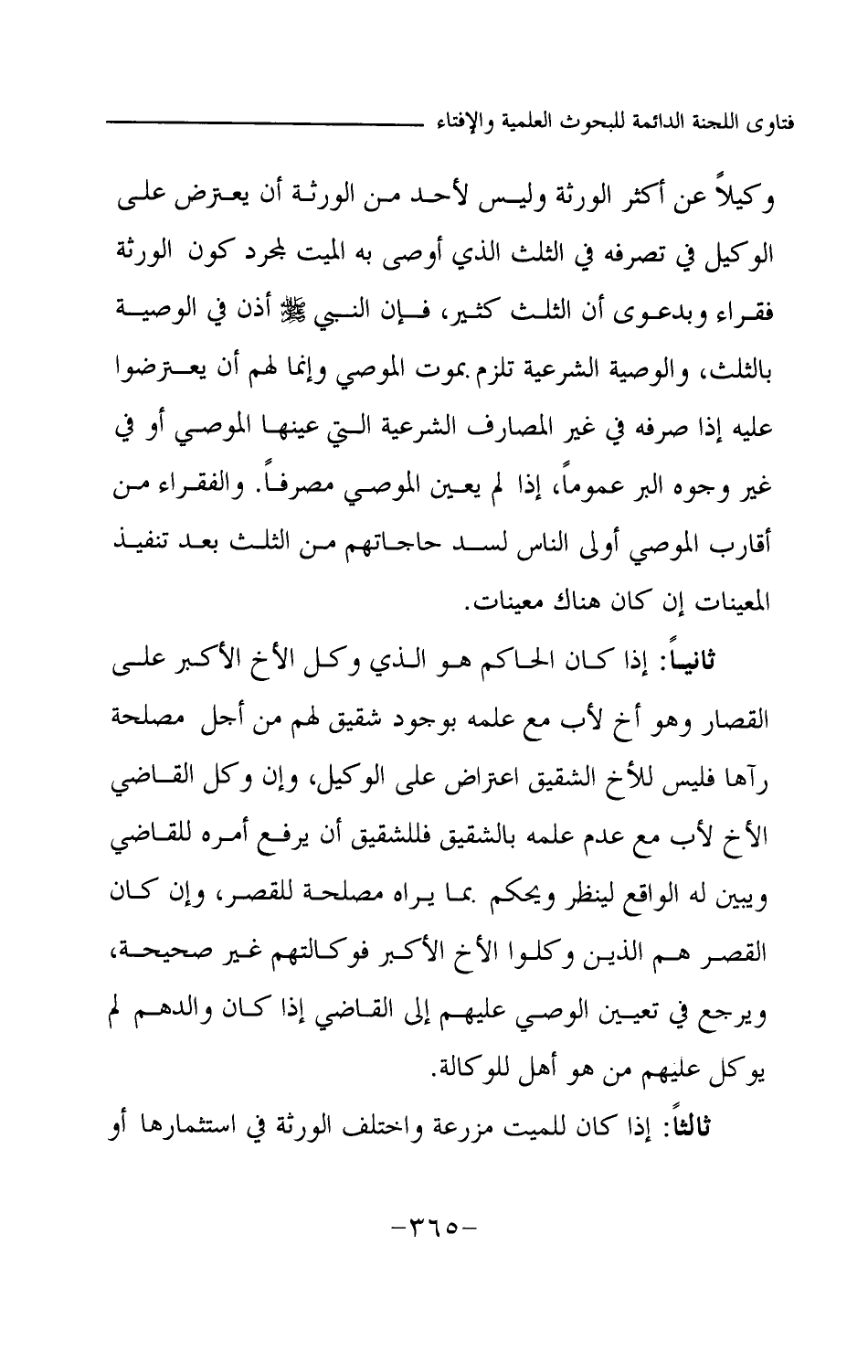 وكيلا عن أكثر الورثة وليس لأحد من الورثة أن يعترض على الوكيل في تصرفه في الثلث الذي أوصى به الميت لمجرد كون الورثة فقراء وبدعوى أن الثلث كثير، فإن النبي -صلى الله عليه وسلم- أذن في الوصية بالثلث، والوصية الشرعية تلزم بموت الموصي وإنما لهم أن يعترضوا عليه إذا صرفه في غير المصارف الشرعية التي عينها الموصي أو في غير وجوه البر عموما، إذا لم يعين الموصي مصرفا. والفقراء من أقارب الموصى أولى الناس لسد حاجاتهم من الثلث بعد تنفيذ المعينات إن كان هناك معينات. ثانيا: إذا كان الحاكم هو الذي وكل الأخ الأكبر على القصار، وهو أخ لأب مع علمه بوجود شقيق لهم من أجل مصلحة رآها فليس للأخ الشقيق اعتراض على الوكيل، وإن وكل القاضي الأخ لأب مع عدم علمه بالشقيق فللشقيق أن يرفع أمره للقاضي ويبين له الواقع لينظر ويحكم بما يراه مصلحة للقصر، وإن كان القصر هم الذين وكلوا الأخ الأكبر فوكالتهم غير صحيحة، ويرجع في تعيين الوصي عليهم إلى القاضي إذا كان والدهم لم يوكل عليهم من هو أهل للوكالة. ثالثا: إذا كان للميت مزرعة واختلف الورثة في استثمارها أو
