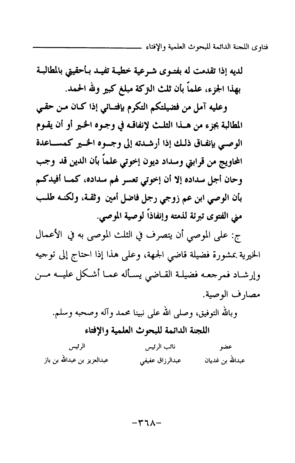 وعليه آمل من فضيلتكم التكرم بإفتائي إذا كان من حقي المطالبة بجزء من هذا الثلث لإنفاقه في وجوه الخير أو أن يقوم الوصي بإنفاق ذلك إذا أرشدته إلى وجوه الخير كمساعدة المحاويج من قرابتي وسداد ديون إخوتي علما بأن الدين قد وجب وحان أجل سداده إلا أن إخوتي تعسر لهم سداده، كما أفيدكم بأن الوصي ابن عم زوجي رجل فاضل أمين وثقة، ولكنه طلب مني الفتوى تبرئة لذمته وإنفاذا لوصية الموصي.